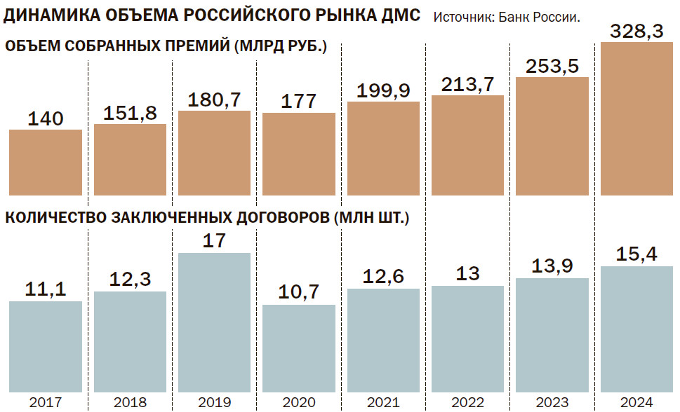 Банк России в своих аналитических материалах отмечает, что в 2024 году работодатели стремились ограничить свои издержки на добровольное медицинское страхование (ДМС) за счет заключения договоров с меньшим набором рисков. Об этом свидетельствует снижение среднего размера страховой суммы на одного застрахованного почти в два раза по сравнению с 2023 годом — до 6,6 млн руб. «В условиях высокой инфляции в 2024 году работодатели оформляли договоры с меньшим набором включенных рисков, чем в предыдущем году. Это позволило им ограничить рост издержек на ДМС без снижения числа застрахованных сотрудников»,— отмечает регулятор.