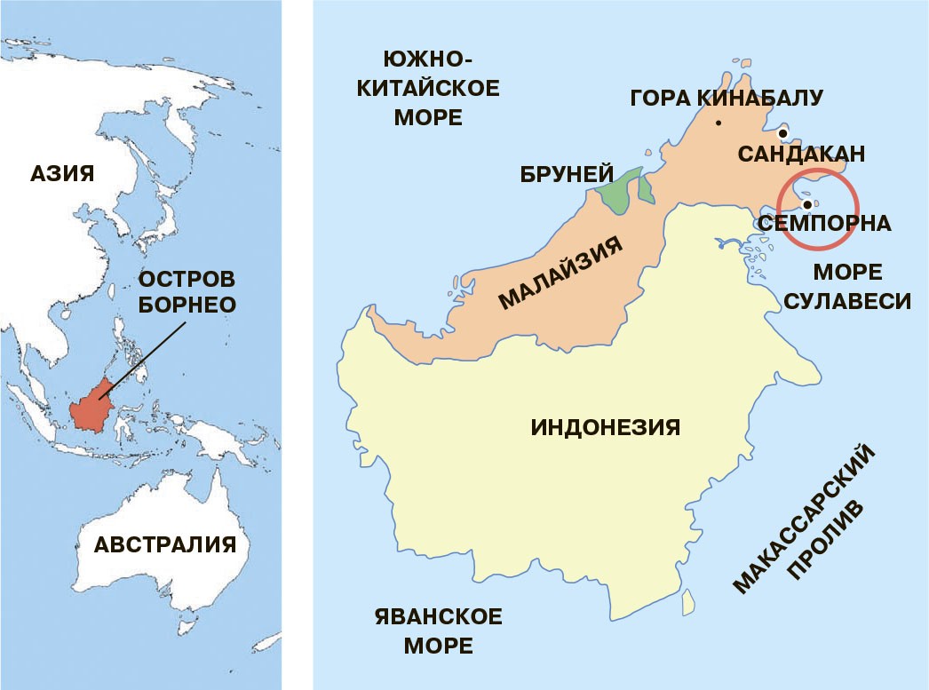 После многочасового полёта с пересадками и однодневной передышкой в столице Малайзии Куала-Лумпуре совершаем перелёт непосредственно на остров Борнео: сначала в городок Сандакан, а затем — в приморский Семпорна. Оттуда рано утром катер стремительно уносит нас в океан, точнее — во внутреннее море, которое носит название Сулавеси.