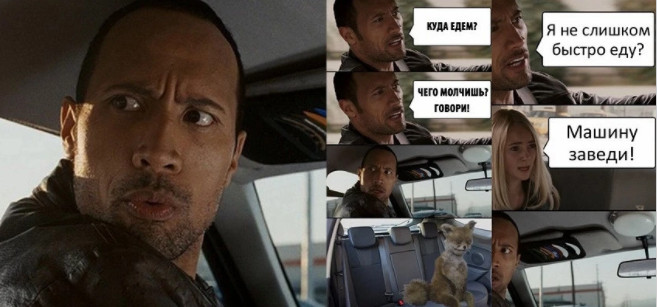 Этот фильм подарил мемную зарисовку с Дуэйном «Скалой» Джонсоном. Речь о моменте, где его герой-таксист оборачивается, чтобы поговорить с девочкой в его машине. Шутники часто «подсаживают» в авто вместо изначального персонажа любых других героев — причем это необязательно могут быть люди.