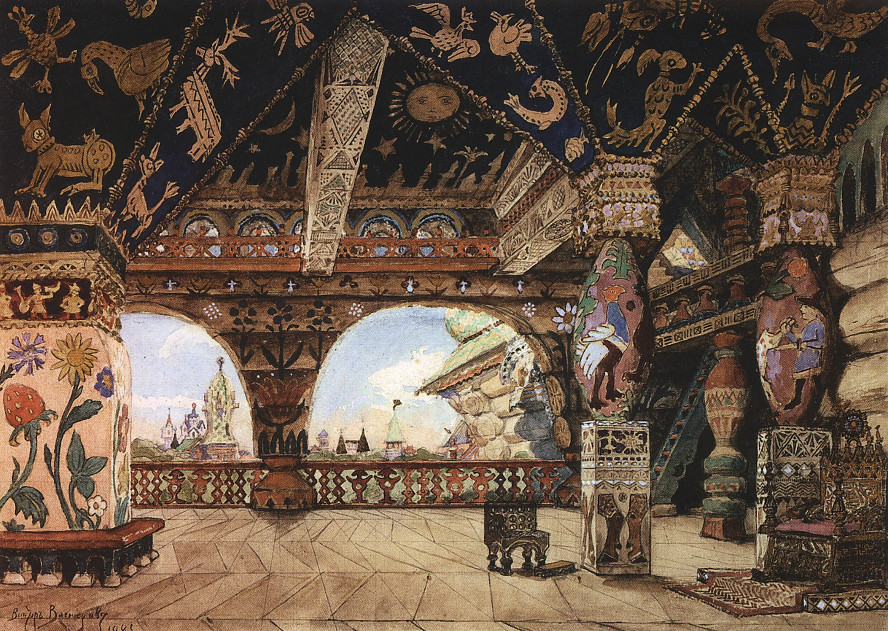 Виктор Васнецов для театральной сцены работал мало, однако его эскизы к «Снегурочке» Александра Островского стали новаторскими в отечественной сценографии. Сначала Васнецов оформил домашний спектакль в усадьбе Саввы Мамонтова Абрамцево. К слову, Васнецов не только исполнил декорации, но и сыграл роль Деда Мороза; Илья Репин был боярином Бермятой, а сам Савва Мамонтов — царем Берендеем. Через три года Виктор Васнецов повторил оформление «Снегурочки», но уже для Московской частной оперы Саввы Мамонтова. Художник вдохновлялся древнерусским зодчеством и народными ремеслами. Вот как писал об этой постановке критик Владимир Стасов: «Васнецов сочинил все костюмы и декорации — в том числе «Палату Берендееву». Это — истинные chef-d’oeuvre (шедевры) театрально-национального творчества. <…> Никогда еще ничья фантазия, сколько я способен судить, не заходила так далеко и так глубоко в воссоздании архитектурных форм и орнаментистики Древней Руси, сказочной, легендарной, былинной. Все, что осталось у нас в отрывках бытовых от древней русской жизни, в вышивках, лубочных рисунках, пряниках, деревянной древней резьбе, — все это соединилось здесь в чудную, несравненную картину. Для любования и изучения не только художников, но и всех развертываются здесь широкие, далекие горизонты».
