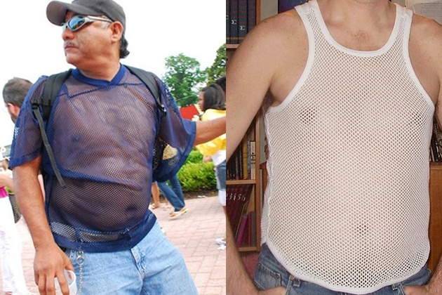 Кошмар любой девушки — увидеть своего мужчину в майке-сетке. Сложно представить, куда вообще можно прийти в наряде, через который просвечивает волосатая мужская грудь (кроме берлинского Berghain), но некоторые экземпляры считают, что это вполне себе casual.