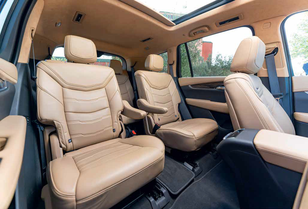 Поработать в режиме школьного автобуса не составило особого труда, ведь открывая дверь XT6 попадаешь в мир подлинной американской роскоши, то есть автобусного простора и будуарного комфорта. К материалам претензий нет: тут и шикарная перфорированная кожа Nappa, и тонированный карбон, и натуральное дерево. Учтены даже такие мелочи, как пластик с имитацией прошитой кожи, чтобы панорама салона в целом смотрелась предельно богато. Но настоящее богатство Cadillac XT6 – это свобода пространства. В свои габаритные пять метров длины (5 050 см) он умещает до семи пассажиров. У нашей версии мест шесть и это очень удобно. Даже взрослый без проблем может добраться до третьего ряда и с комфортом там разместиться. Причём третий ряд здесь не просто опция: от сидений до потолка целых 90 см (при том, что средний ряд можно сдвинуть вперёд никого не стесняя), подстаканники, подлокотники, зарядки для гаджетов и управление климатом. Поэтому в дальнем путешествии, по прибытии в место назначения, обязательно проверяйте не забыли ли вы пригревшегося и уснувшего на галёрке. Впрочем, об этом вам напомнит бортовой компьютер, выдав на центральном дисплее предупреждение: «Проверьте, не забыли ли вы чего-нибудь на задних сидениях». Вероятно, были прецеденты.
