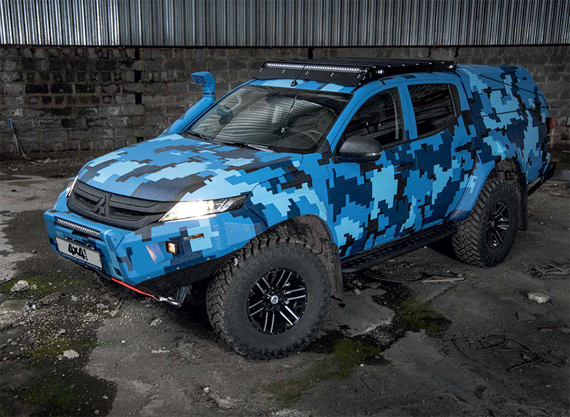 Этот Mitsubishi L200 в ярко-синем камуфляже — проект сибирского технического центра STC, практикующего именно такой подход. Заказчику предлагают базовый набор доработок, который можно дополнить различными опциями: силовыми бамперами, светом, порогами, защитным покрытием кузова и другими полезными вещами, жизненно необходимыми в случае, когда до ближайшего населённого пункта не один десяток километров, а под колёсами не дорога – а одно название. Или вовсе сплошное бездорожье.