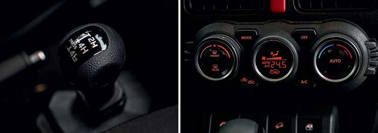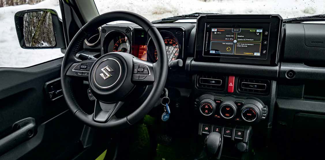 Да и приборная панель, учитывая поправку на современность, - копия «самурайской», и не беда, что из-за красноватой подсветки она читается хуже безликой, зато более контрастной панели прежнего Jimny. Особый восторг - поручень для штурмана над бардачком, он тоже переехал на торпедо прямиком с «Самурая». Климат-контроль вместо кондиционера да ещё и с собственным дисплеем - шикарно! Кнопки стеклоподъёмников, о которые все вечно бились коленкой, перенесли на центральную консоль, как у Jeep Wrangler, - отлично. Может быть ещё съёмные двери и крышу сделать? Оседлав ретроволну, дизайнеры вернули даже рычаг переключения режимов трансмиссии, потеряв дополнительный подстаканник, что в тесном салоне весьма ощутимо. Да и пользоваться кнопками предыдущего Jimny было намного проще. При этом к сервоприводам претензий нет - срабатывают они быстро и чётко. Лучше бы дизайнеры придумали подходящий по стилю декор для медиасистемы, копипастом перенесённой с Suzuki Vitara. Она выглядит совершенно чужеродным элементом, а толстая глянцевая рамка дисплея никак не вписывается в общую картину. Даже дилерское головное устройство старого Jimny казалось более гармоничным, не говоря уже о том, что неродная мультимедиа на базе Android работает быстрее и у неё более развитый функционал (хотя без кнопок на руле управляться с ней непросто).