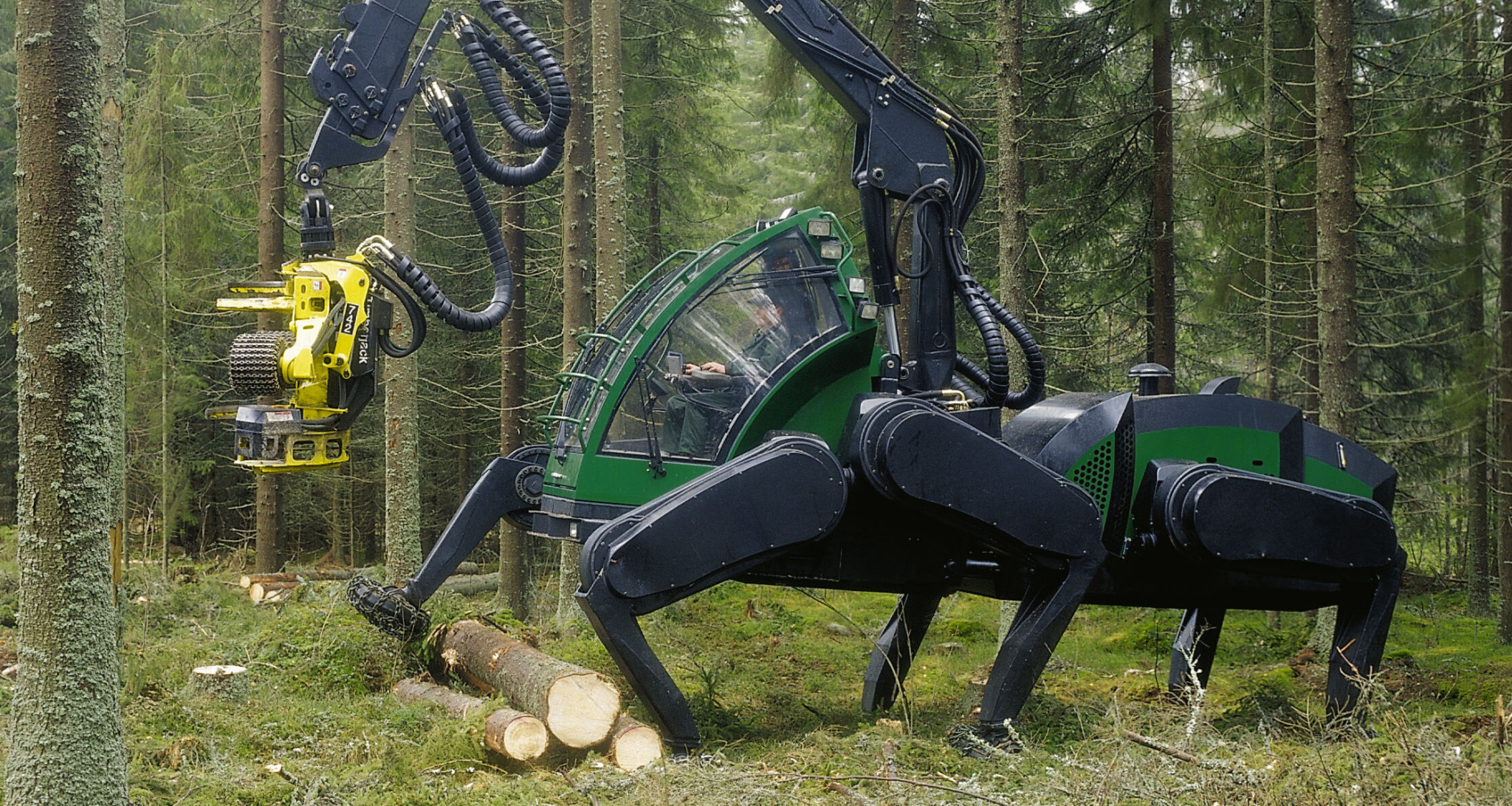 Инженеры John Deere попросили своих детей спроектировать технику повышенной проходимости… Шутка. Для участия в специализированной выставке компания построила классный прототип - полноценный ходячий харвестер! Да-да, у этой штуковины шесть автономных гидравлических ног, которые могут двигаться во всех плоскостях, ну и полноценный для харвестера инструментарий: здоровенная пила для “стрижки” деревьев под корень, удаления с бревен сучков и шинковки стволов. Признайтесь, вы наверняка что-то подобное рисовали в детстве на задних страницах тетради по математике?