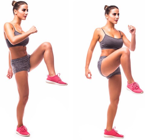 Встань в исходную позицию и начни бег на месте, подтягивая колени к груди. Следи, чтобы работали руки, и старайся двигаться настолько быстро, насколько ты можешь. Выполни как можно больше повторений за 20 секунд с максимальным усилием, а затем возьми 10 секунд отдыха. Повтори это упражнение восемь раз. Отдохните в течение одной минуты, а затем переходите к следующему упражнению.