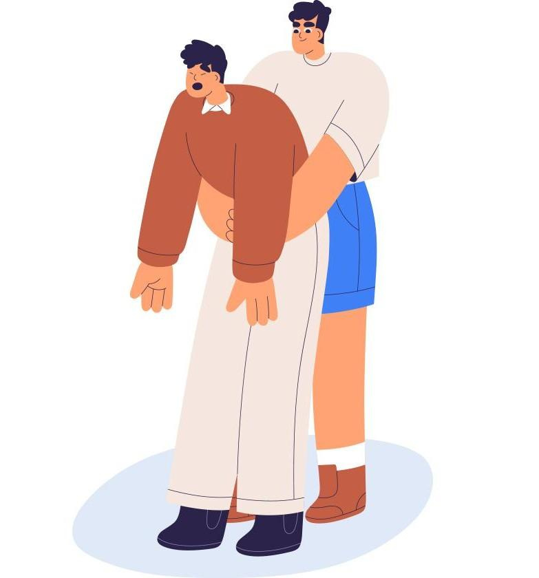 Как правильно? Если человек может дышать, не трогайте его. А вот когда на вопрос «Ты можешь дышать?» он отрицательно мотает головой или вообще ничего не отвечает, нужно помочь ему согнуться так, чтобы спина была параллельна полу, и раз пять очень сильно хлопнуть открытой ладонью по центру спины.