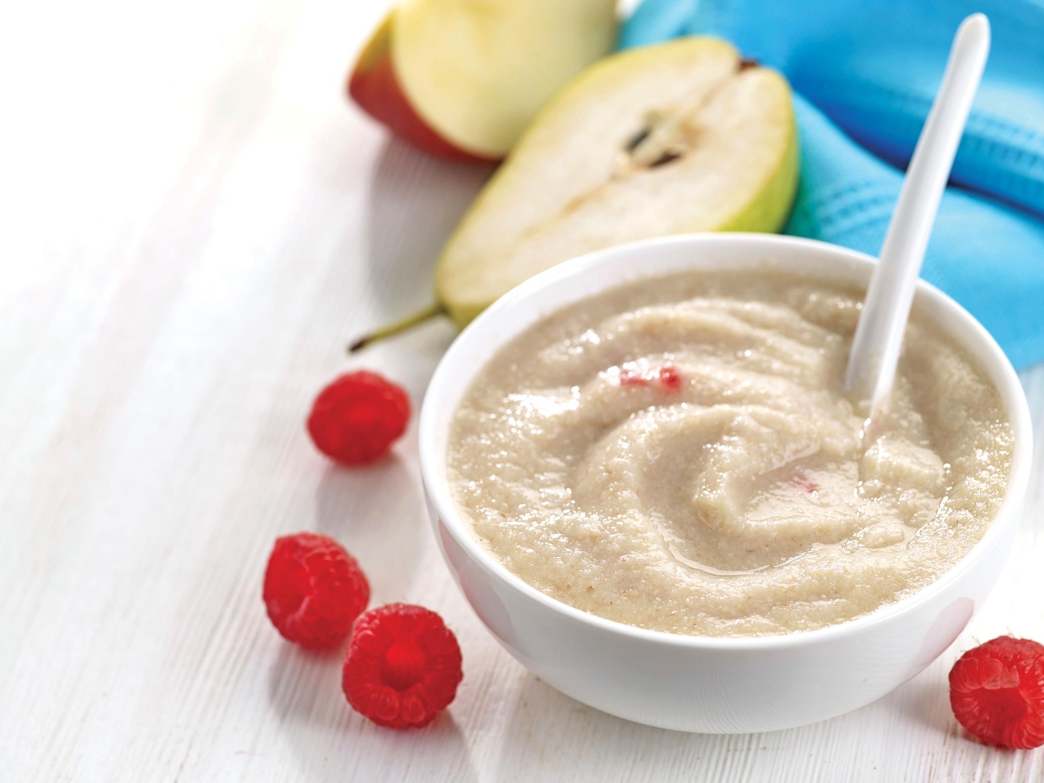 Первыми в меню малыша вводятся низкоаллергенные каши, не содержащие глютен (рисовая, гречневая, кукурузная). Глютен (клейковина) – растительный белок, входящий в состав оболочки зерна пшеницы, овса, ржи и ячменя. Он тяжело переваривается в незрелом кишечнике у малышей из-за низкого содержания расщепляющего его фермента пептидазы. В результате, при раннем введении глютенсодержащих продуктов (особенно до 6 месяцев), у ребенка могут возникнуть реакции непереносимости (боли в животе, вздутие, нарушение стула, высыпания на коже и пр.). В редких случаях, при наличии наследственной предрасположенности, у малыша может развиться тяжелое заболевание целиакия, требующее соблюдения безглютеновой диеты (исключения всех продуктов, содержащих глютен) в течение всей последующей жизни.