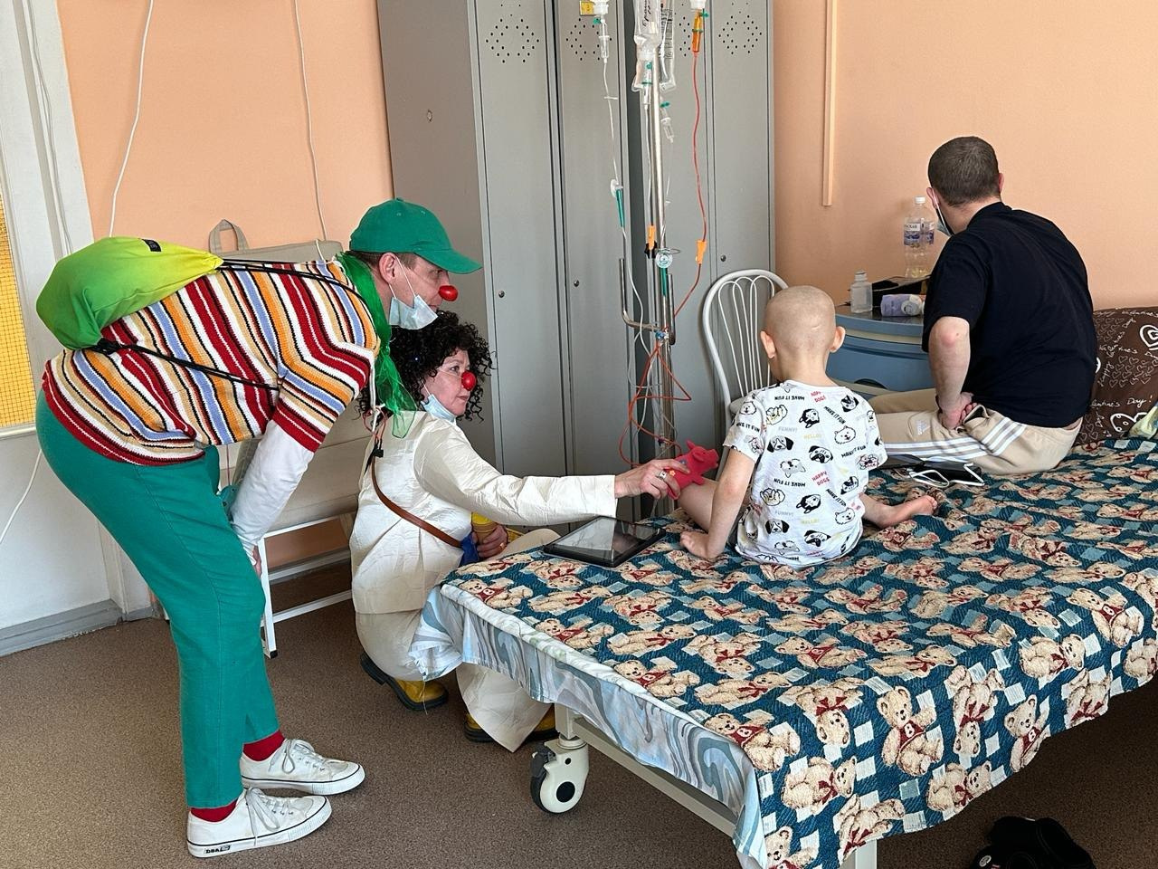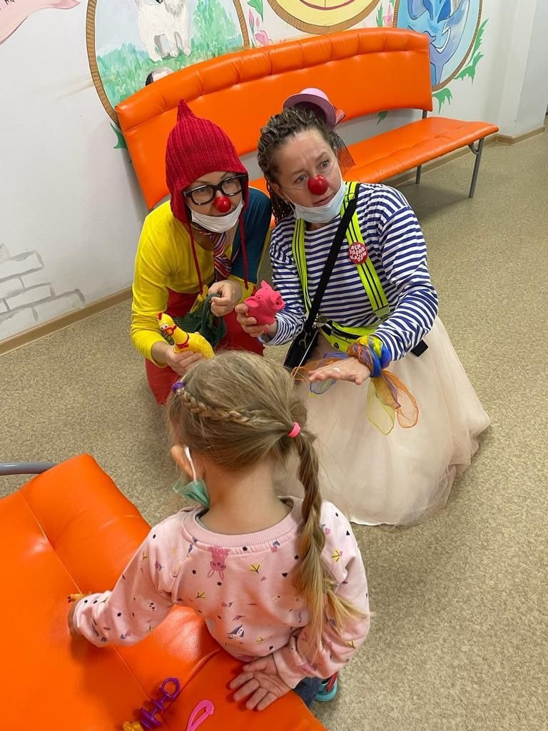 У медицинского клоуна нет сценария и заготовленной программы. Он идет от момента «здесь и сейчас», от атмосферы в палате, от состояния ребенка, это всегда импровизация. Каждая палата — как выход в открытый космос, в неизвестность, это интересная, но эмоционально и энергетически затратная история. И клоуны в паре служат друг другу поддержкой, плечом и красным носом. Поэтому перед выходом важно сонастроиться, продышаться вместе, подержаться за руки, почувствовать друг друга и уже вместе перешагнуть порог отделения. Это раз. Еще работа в паре снимает с ребенка обязанность сразу же включаться в контакт с клоуном. Не все дети, увидев на пороге палаты красноносого гостя, моментально готовы с ним играть — кому-то нужно время, чтобы побыть просто наблюдателем. И через игру между собой клоуны создают некое безопасное пространство для ребенка, в которое он может вовлечься, если захочет.