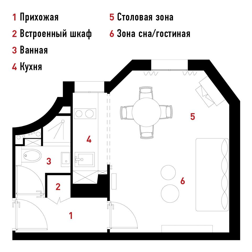 Автор проекта вспоминает, что до ремонта квартира выглядела “грустнее не придумаешь”. Но были у нее и достоинства. Во-первых, она находится в красивом доме в ныне популярном Девятом округе. А во-вторых, здесь высокие потолки. “Это сразу придает элемент торжественности даже самому маленькому пространству”, — говорит дизайнер. Во время ремонта она немного “подрезала” ванную, чтобы организовать большой встроенный шкаф, а вот прихожую трогать не стала, так как считает это помещение обязательным, особенно в маленькой квартире. “Прихожая служит буфером между внешним