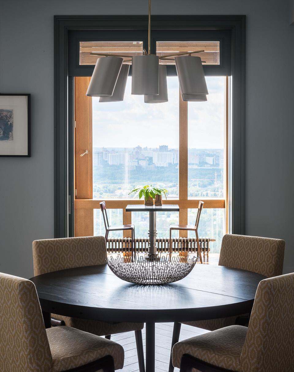 Во многих историях окна или вид из них задают тон интерьеру. В этом проекте с ними тоже пришлось считаться. К примеру, их конструкция и обрамление стали причиной появления элементов в стиле ар‑деко, несмотря на то что жилье находится в стеклянной новостройке. Они же повлияли на планировку: “Ширина квартиры от одного стеклянного фасада до другого — восемнадцать метров. Чтобы было достаточно дневного света, глубина комнаты не должна превышать шести метров, поэтому получалось, что в центре квартиры оставались шесть метров темноты”, — говорит Ольга, автор проекта, дизайнер и член АДДИ. Это темное место заняла прихожая со старинным каминным порталом XVIII века. Справа расположилась общественная зона, а слева — гардеробные, детские и хозяйская спальня.