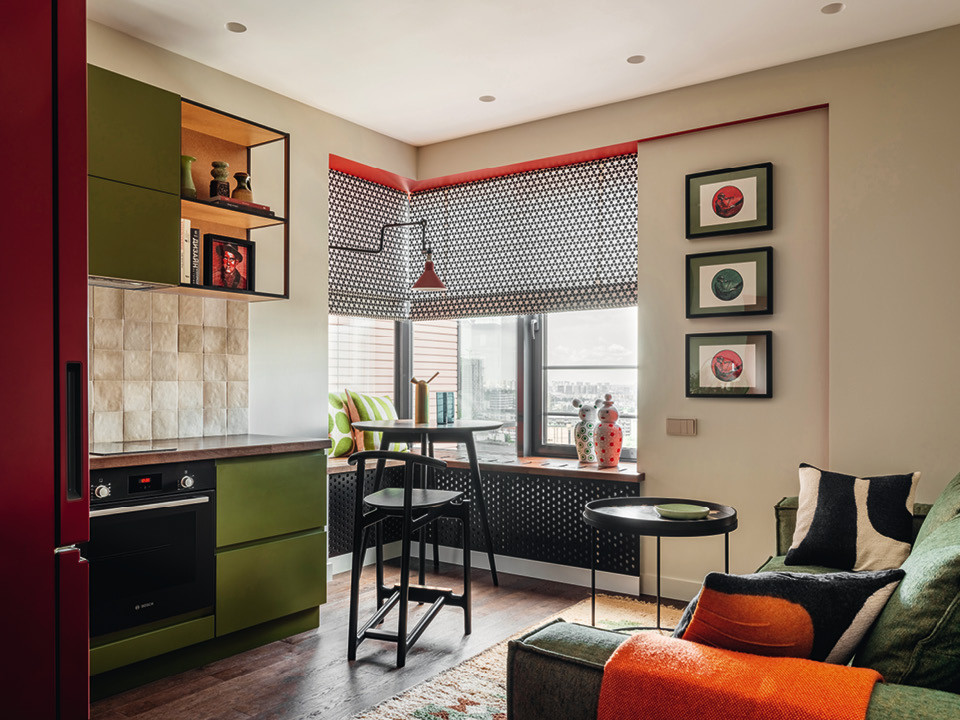 Квартира в оливковых и красных оттенках по проекту Татьяны Архиповой.