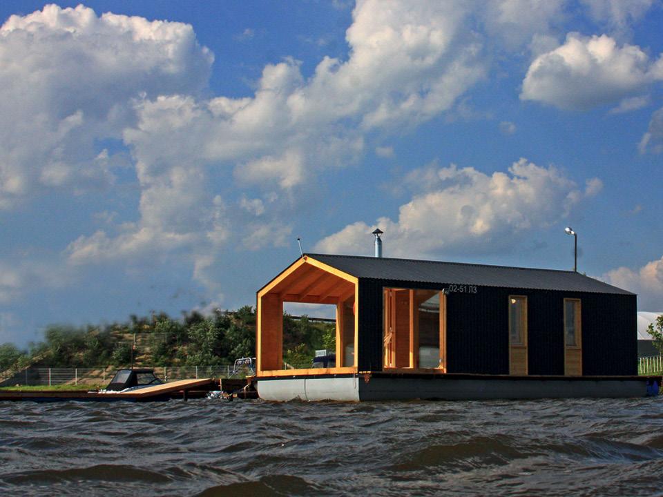 Московское архбюро придумало целую серию модульных всепогодных домов, которые целиком собираются на заводе, вплоть до сантехники, так что покупателю остается только подключить свое жилье к коммуникациям. На фото — плавучая и к тому же самая компактная модификация, всего 26 м², на которых разместились прихожая, общая зона с кухней и санузел. При помощи катера такой дом можно отбуксировать куда угодно. Сейчас его используют как гостиницу при яхт‑клубе.