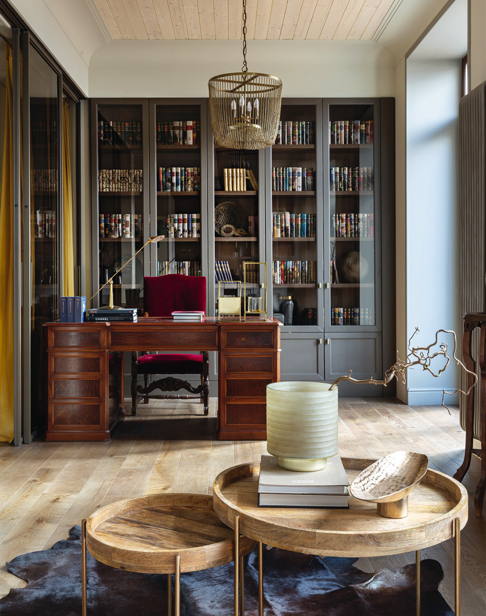 Квартира расположена в самом центре Москвы и по своему образу и настроению очень соответствует месту: дом 1943 года выходит на Тверскую улицу, а окна самой квартиры смотрят в типичный старомосковский дворик, окруженный разномастными желтыми стенами и металлическими скатными кровлями. Вид из окна, старый дом с толстыми кирпичными стенами и высокими потолками и сам характер заказчицы — молодой, яркой и очень творческой — подсказали образ многослойного нюансного интерьера, полного историй и деталей, которыми хозяйка с удовольствием продолжает его наполнять.