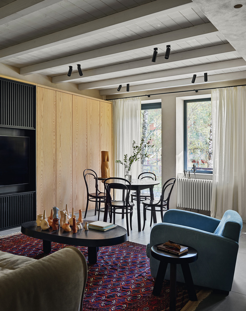 В новосибирском Академгородке дизайнер Семен Бортник постарался создать атмосферу старой интеллигентской квартиры, хотя заказчик, с которым они познакомились во время отдыха в Испании, очень хотел интерьер с морской тематикой. Ее отголоски тут тоже есть: фактурная штукатурка, балки и светлое дерево в отделке напоминают о домах на берегу моря. А вот образ старой квартиры складывается из винтажных и антикварных вещей, многие из которых принадлежат хозяину. “В то же время мне хотелось