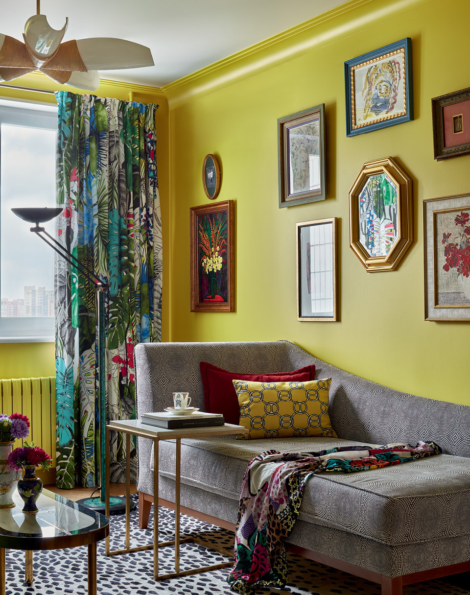 Владелица этой трехкомнатной квартиры сразу произвела впечатление на Анастасию Кузнецову. “Она человек с неординарным вкусом в одежде и тягой ко всему прекрасному — часто ходит на выставки, любит винтаж, коллекционирует шляпы и советский фарфор, — говорит автор проекта. — На первой же встрече она сказала: “Хочу желтую гостиную, леопардовый принт и золотую кухню”. Жонглируя пестрыми образами и сочными оттенками, дизайнер создала многослойный и очень гедонистический интерьер.