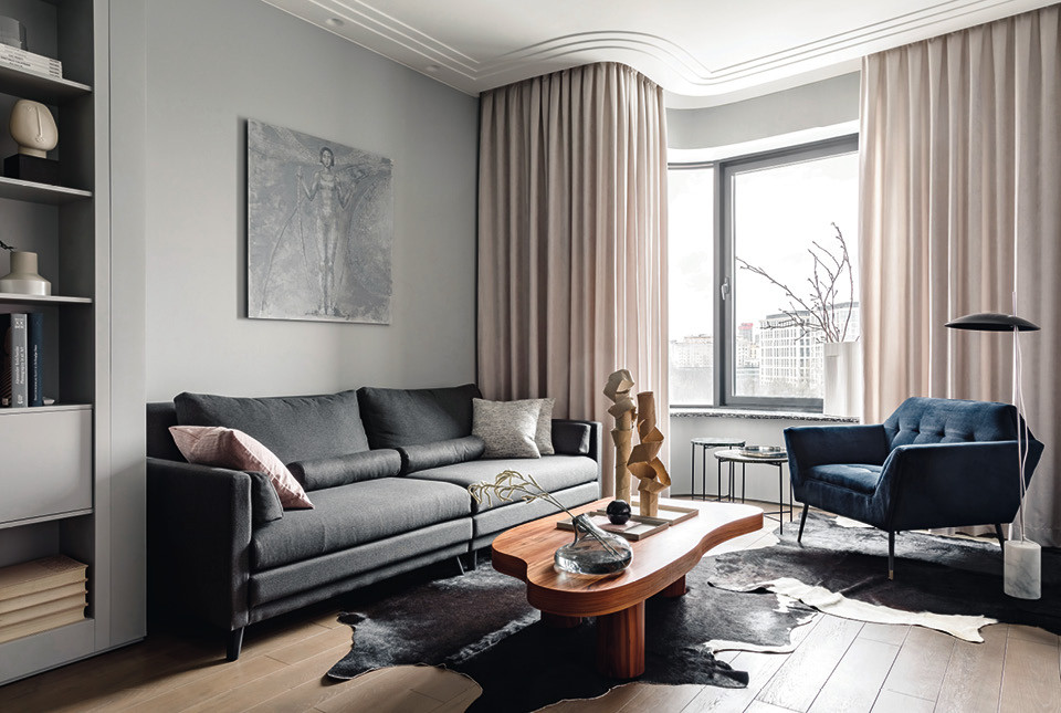Ради того чтобы жить поближе к центру, заказчики Павла Железнова и Ивана Позднякова, молодая семья с ребенком, переехали в эти апартаменты из более просторного жилья. Их прежняя квартира была на 20 м² больше, так что перед авторами проекта стояла задача нивелировать эту потерю. Отчасти этому помогли сами клиенты. Как рассказывает Павел, заказчик просил не перегружать интерьер мебелью, стены сделать серыми, а в довершение всего настоял на том, чтобы лампы в квартире были исключительно холодного света. “Хотел избежать ощущения бабушкиного уюта”, — рассказывает Павел. Работать над интерьером Железнов начинал один, а Иван Поздняков подключился в процессе — для них это был пробный проект, по итогам которого родилось их общее бюро P+Z.