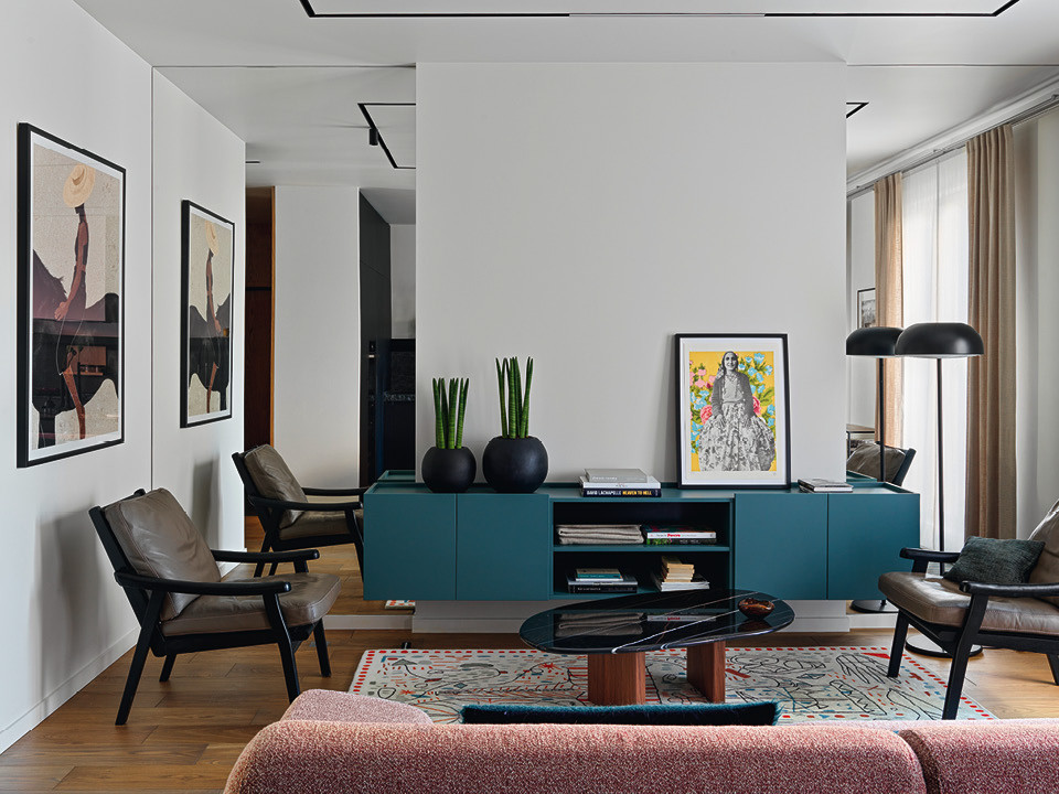 Анастасия Хальчицкая и ее муж Али Мамедов жили в квартире в старом фонде и подумывали приобрести жилье попросторней. “И тут мы увидели в продаже квартиры в доме по проекту Сергея Чобана, работы которого я очень люблю, — рассказывает дизайнер. — Мы выбрали квартиру на втором этаже, отсюда есть выход на общее патио во внутреннем дворе, и она на две стороны, поэтому у нас во всех комнатах много естественного света”. Супругам предстоял первый совместный ремонт, и Анастасия предложила мужу сделать “домашнее задание”: выбрать те интерьеры, которые ему нравятся. Оказалось, что оба предпочитают минимализм, и они вместе приступили к работе.