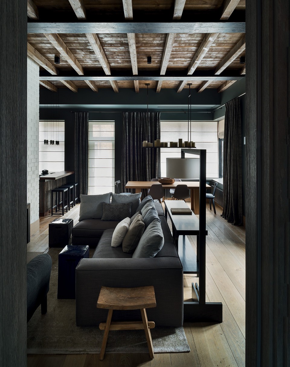 Анна и Александр Краузе оформили в бывшем промышленном гараже трехуровневое пространство, в котором перемешали индустриальную эстетику и элементы шале.