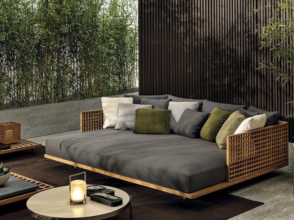 Марка впервые выпустила коллекцию уличной мебели. Среди новинок: диван Zante, столик Zefiro и пуф Bangkok. Диван сделан