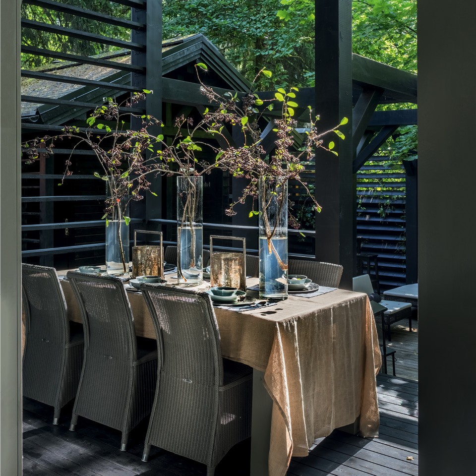 На небольшом участке уже стоял дом, росли березы, сосны, елки и мхи, а в самом солнечном месте от стены дома до соседского забора было всего шагов десять. Это ограниченное пространство Илона с сестрой Ириной решили не освобождать, а полностью застроить. Дизайнеры рассказывают: “Нам пришла идея пристроить к дому деревянную конструкцию — большую террасу. Мы стали постепенно выстраивать ее, планируя летнюю кухню, каминную зону. Если просто растет трава, то пространство кажется очень маленьким, а как только начинаешь настилать доски, терраса становится частью интерьера, ее размер кажется другим”.