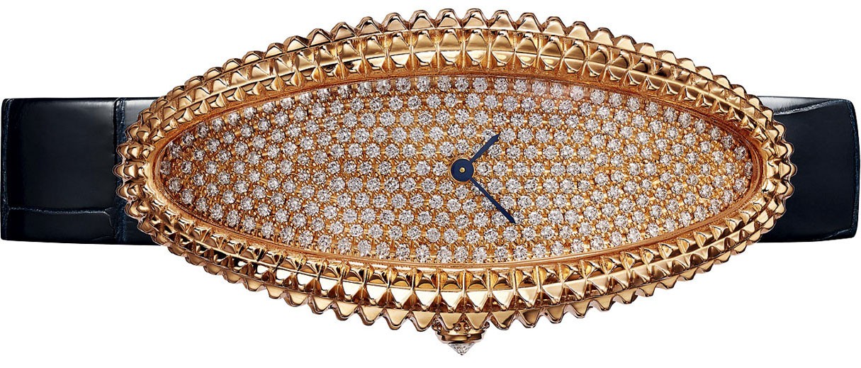 В этих часах ретро-настроение считывается сразу. И неудивительно: модель овальной формы, напоминающую вид ванны сверху, Луи Картье придумал еще в 1912 году. За сто с лишним лет она несколько раз меняла очертания, становясь то шире, то длиннее. За основу серии Baignoire Allongée взята версия 1960‑х годов. На фото модель из розового золота и бриллиантов с механизмом 1917 MC. Она выпущена серией 100 экземпляров.