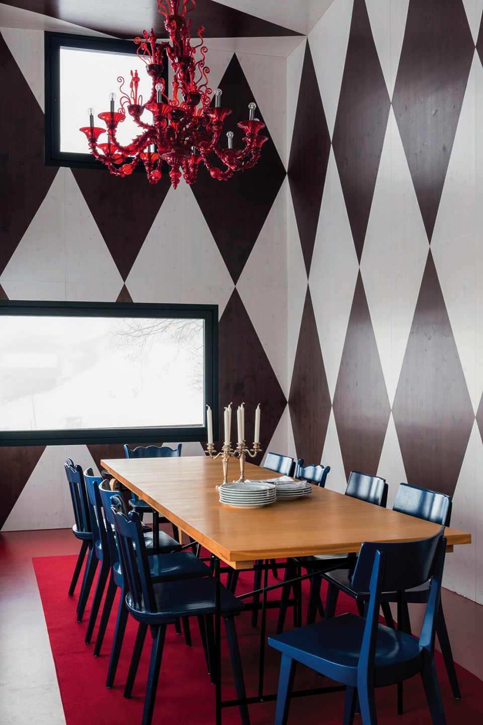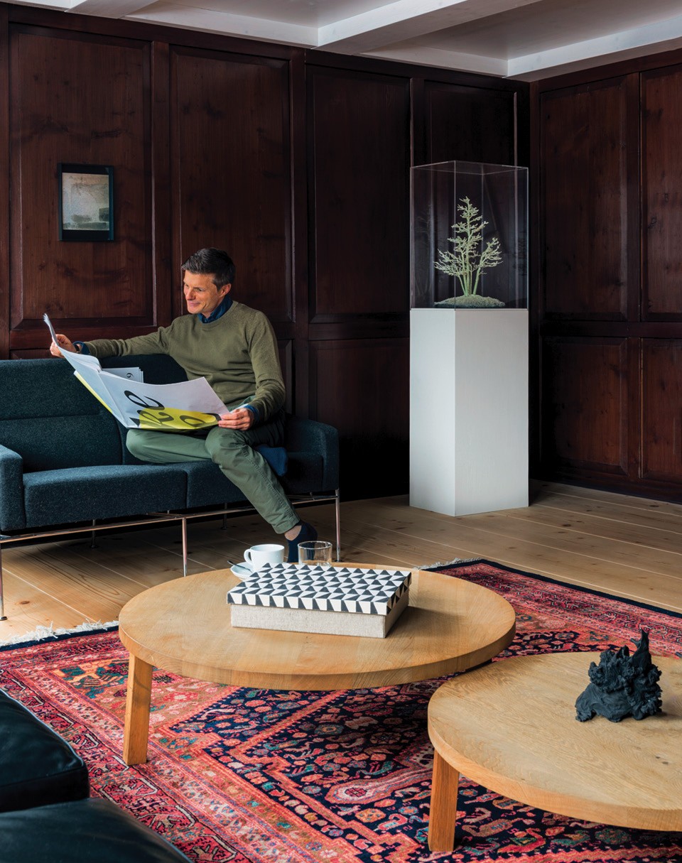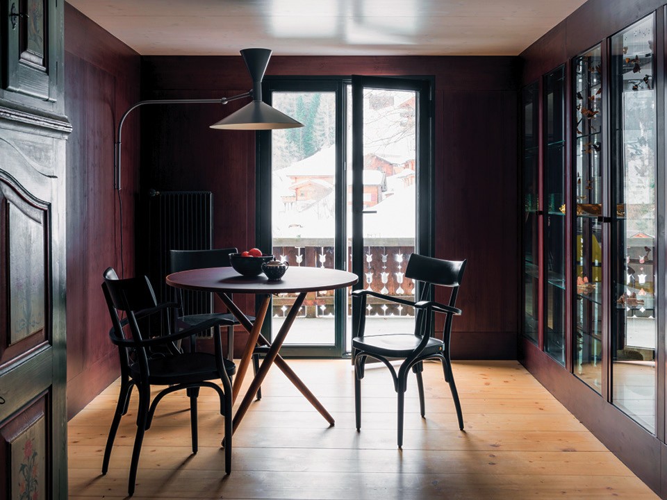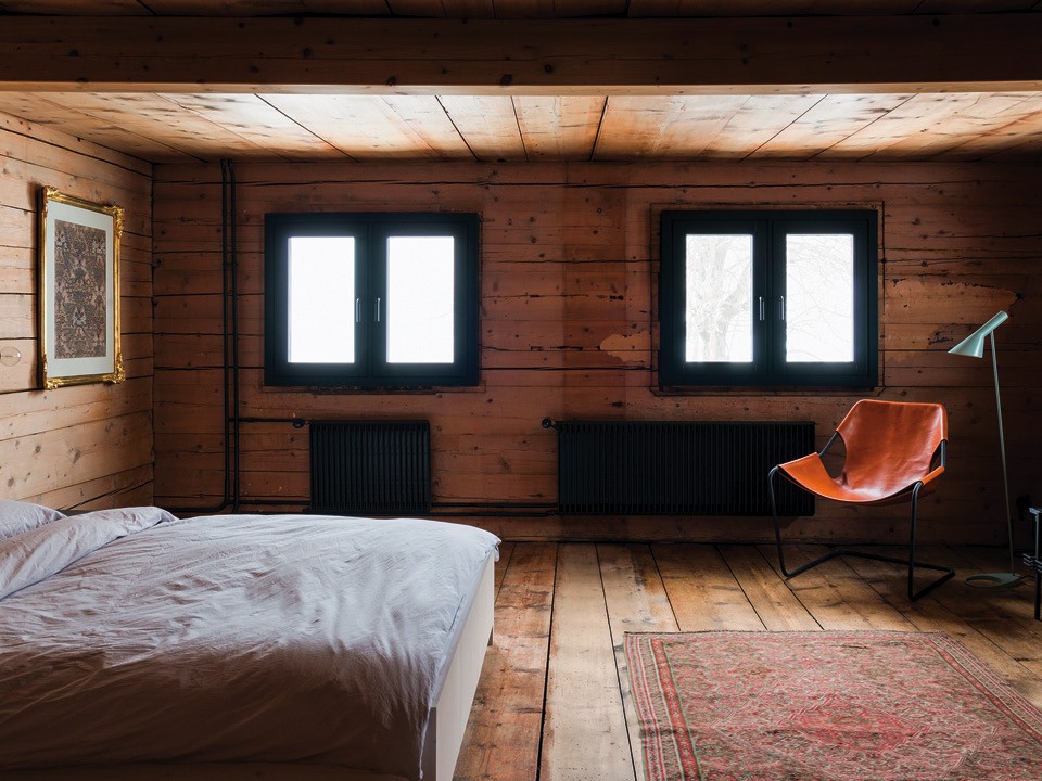 Внешность бывает обманчивой, и это шале Aux Losanges в деревушке Чирчен в долине Шанфигг тоже не то, чем кажется на первый взгляд. Сам дом был построен в 1869‑м, и на протяжении почти ста пятидесяти лет в нем располагались кафе и ресторан. А в 2014 году все изменилось: новые владельцы, швейцарские коллекционеры Стефан Ломбарди и Армин Цинк, надумали превратить бывшую таверну в загородный дом и проводить в нем выходные и праздничные дни. Они сразу решили, что обойдутся без традиционного “альпийского шика”: оленьих рогов, чучел диких животных и открытого очага. “Все это слишком предсказуемо и банально”, — говорят хозяева.