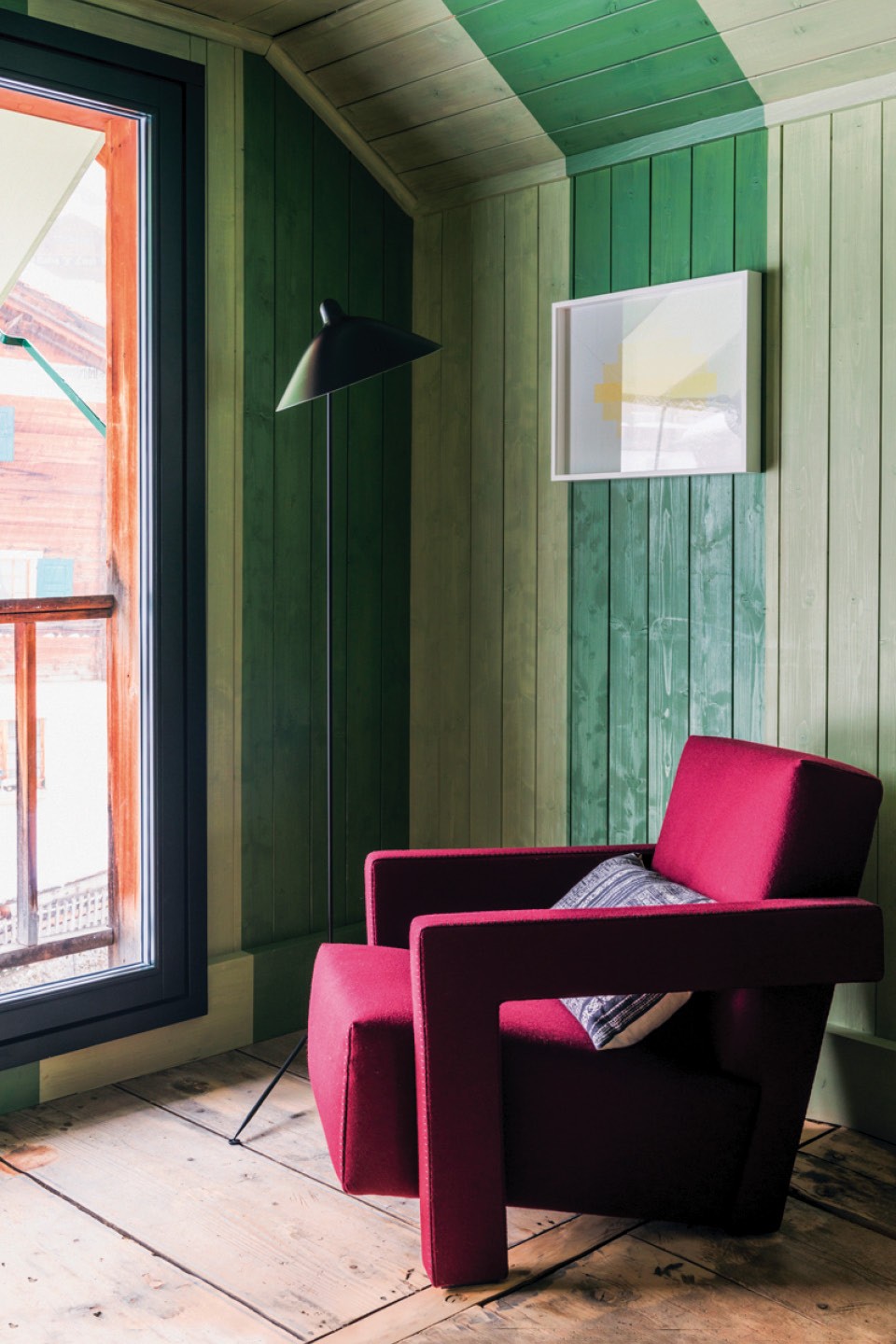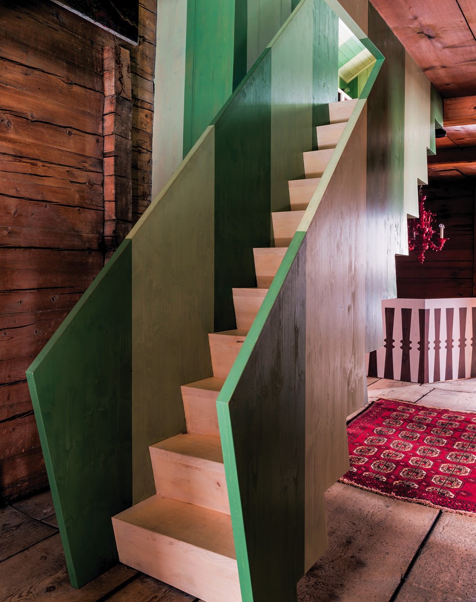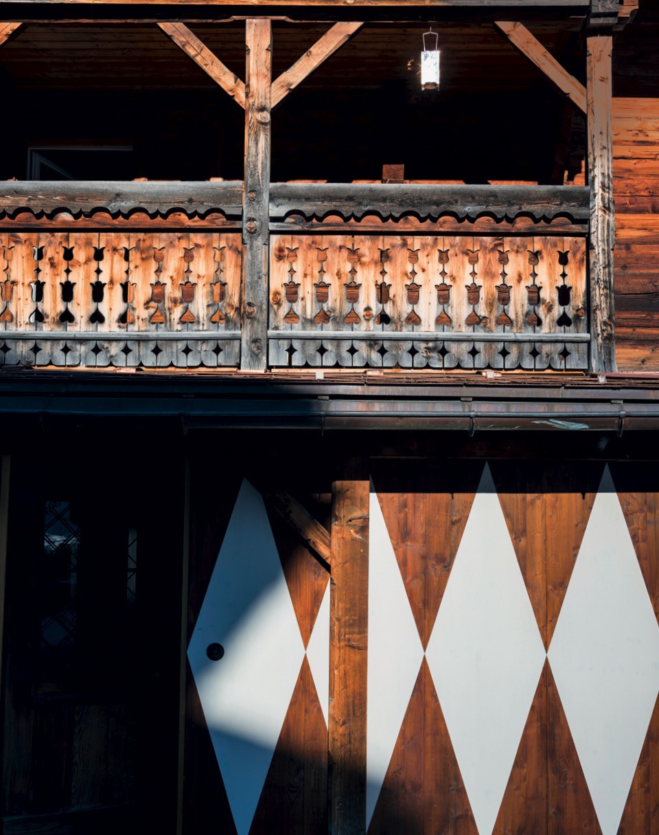 В целом интерьер шале получился довольно эклектичным. В более современной двухэтажной пристройке (ее датируют 1950‑ми годами) убрали перекрытия и сделали единое двусветное пространство, а стены расписали ромбами. Эта часть шале используется как столовая и общественная зона: здесь устраивают литературные чтения, концерты и перформансы. Хозяева вообще не против пускать к себе людей. Когда они подолгу отсутствуют, сдают комнаты отдыхающим, приезжающим на горнолыжный курорт. Сейчас во всех помещениях можно обнаружить картины и арт-объекты, созданные молодыми швейцарскими художниками, а весной 2020 года здесь пройдет выставка швейцарского видеоарта.
