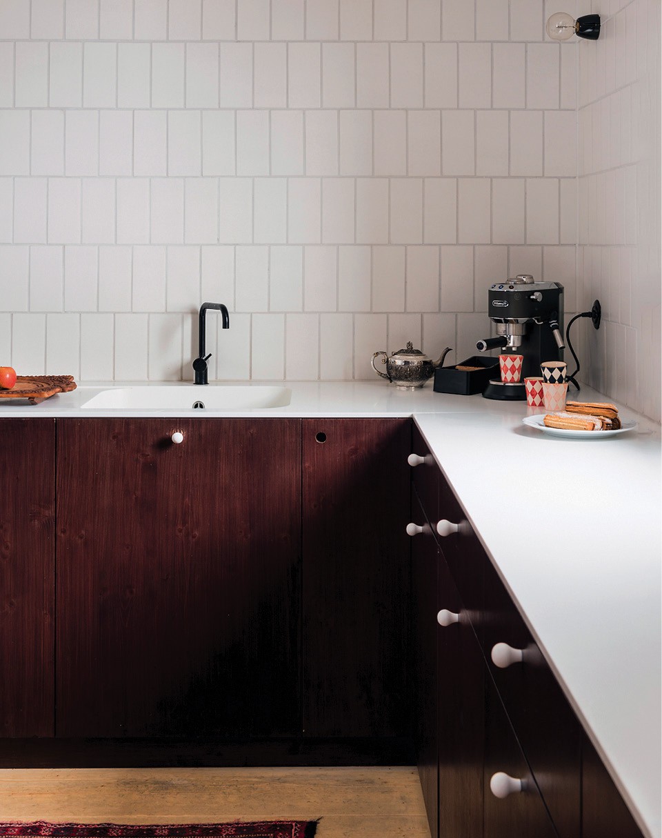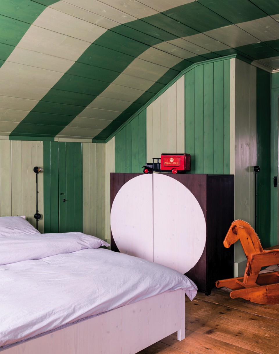 Хозяева и архитекторы трепетно отнеслись к исторической постройке, которая им досталась. Они собирались лишь освежить стены и пол и максимально оставить на виду все деревянные детали интерьера. Однако конструкция хорошо сохранилась лишь в нижней части дома, и только там была возможность обойтись без отделки. На других этажах на выручку пришли деревянные панели и краски. “Мы решили зашить и закрасить проблемные места и те, где не сохранилась оригинальная кладка”, — объясняют хозяева. К оформлению собственного интерьера они подошли с чувством юмора: к примеру, нарисовали на деревянном ограждении лестницы, ведущей на второй этаж, балясины-обманки, а потолок и стены во всех помещениях на самом верху выкрасили широкими полосами двух оттенков зеленого — так комнаты стали напоминать шкатулки, полностью оклеенные обоями. Таким же образом они разукрасили ограждение лестницы, ведущей сюда, создав своеобразную интригу.