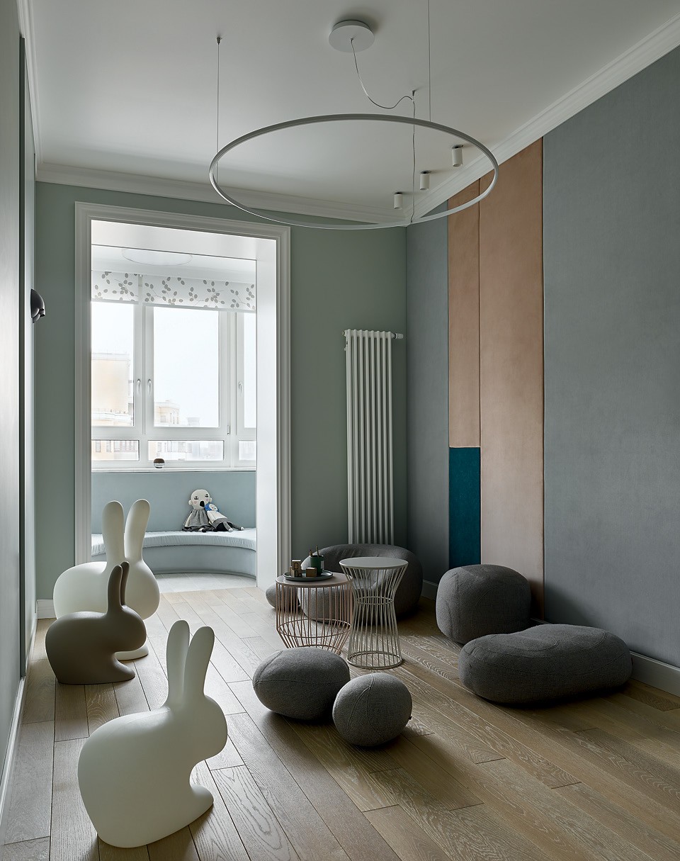 Заказчик Екатерины Угловой присоединил к квартире еще одну такую же и решил полностью “отдать” ее детям. Дизайнер сделала здесь три детские и игровую (она заняла помещение кухни). Основную концепцию и элементы оформления — плинтусы, карнизы и двери — она продублировала из взрослой части квартиры, а детскую тему ввела деликатно: в одной комнате нарисован космонавт, во второй — фламинго, а в третьей — Маленький принц. “Эта жилая часть более функциональная, — объясняет Екатерина. — Мобильные и модульные конструкции позволяют быстро реорганизовывать пространство для занятий, игр или отдыха. Дети вообще могут сами менять и достраивать мир вокруг себя”.