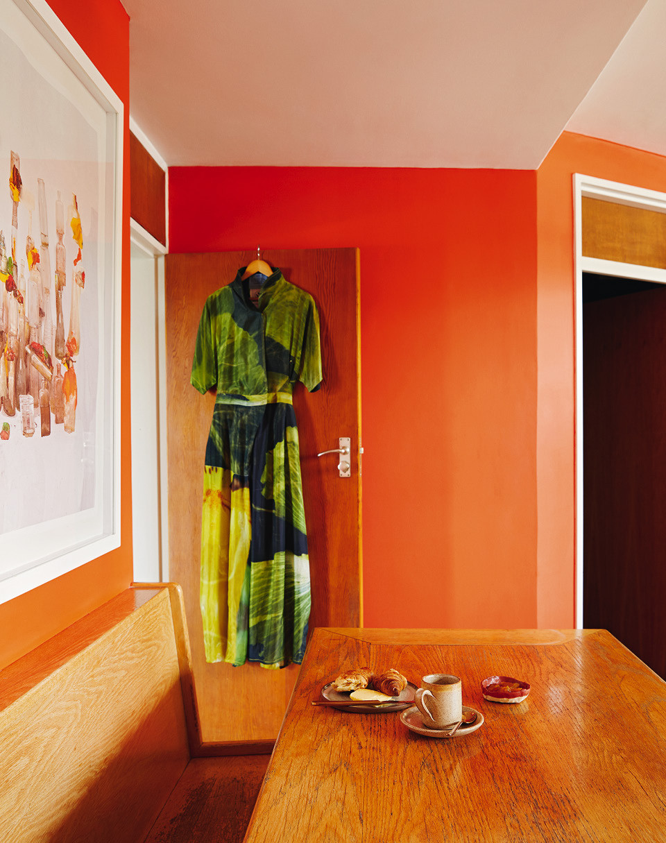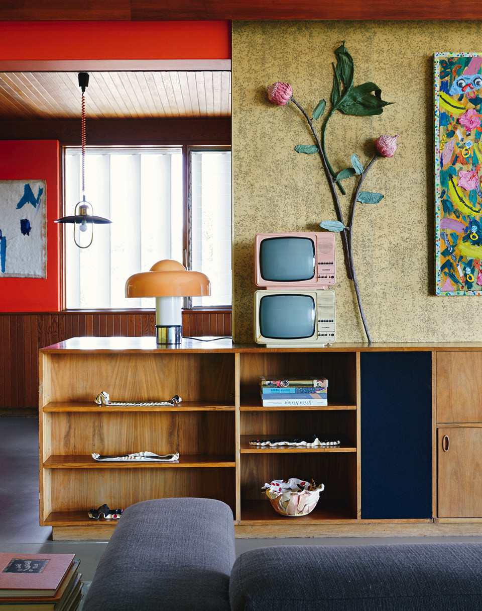 За почти шестьдесят лет дом всего дважды менял владельцев — Лезанн с мужем стали третьими, — и это объясняет замечательное состояние интерьеров. Встроенные шкафы в гардеробной, кухня, стеновые панели и даже потайной винный холодильник с аудиосистемой — все это было в целости и сохранности. Новым хозяевам оставалось лишь слегка освежить обстановку. “Нет ничего лучше краски!” — считает Лезанн, чьими стараниями дом окрасился в сочные яркие цвета. “Мне хотелось сохранить дух модернистской архитектуры, — говорит она. — Я выяснила, какие краски были популярны в 1960‑е годы, и отобрала те из них, что мне больше всего нравятся”.