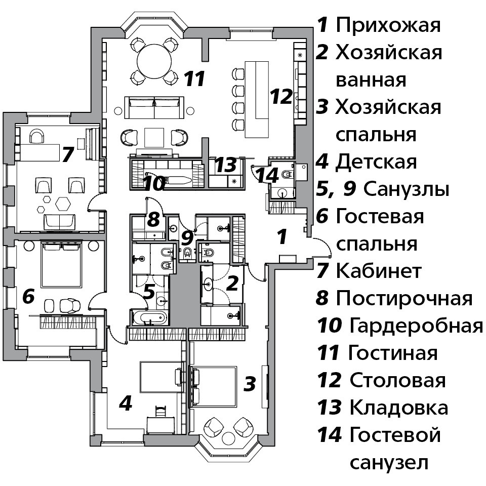 Организованная таким образом работа позволяет получить на выходе один в один то, что было на картинках. “Если вы посмотрите визуализации, сделанные за полтора года до сдачи объекта, то увидите, что в жизни все точно так же”, — продолжает Родион. В этой квартире у него много поводов для профессиональной гордости, и один из них — планировка. “Уже прошло столько времени, а я до сих пор ею горжусь. Нам удалось сделать здесь круговое движение с интересными маршрутами”, — говорит архитектор. Изначальные данные квартиры были хорошими: площадь двести пять квадратных метров и окна, выходящие на три стороны. Если взглянуть на план, то видно, что коридоры, соединяющие комнаты, образуют букву H, их Праздников называет “хабом”. Центральную часть квартиры занимают блоки с санузлами,