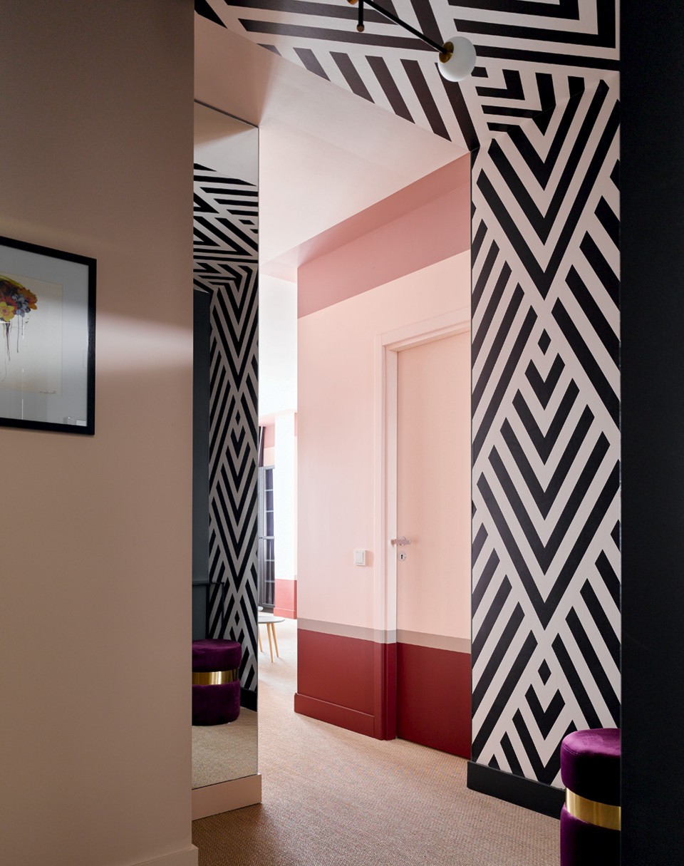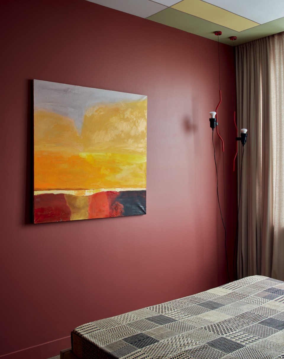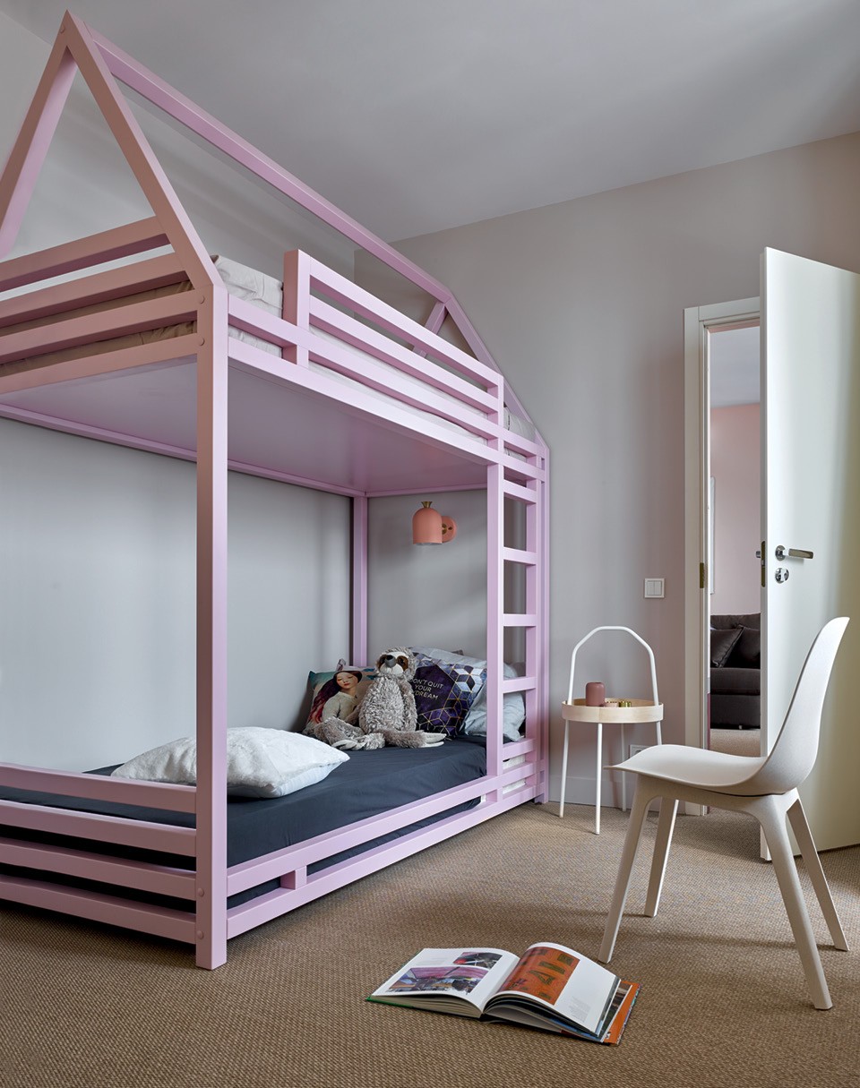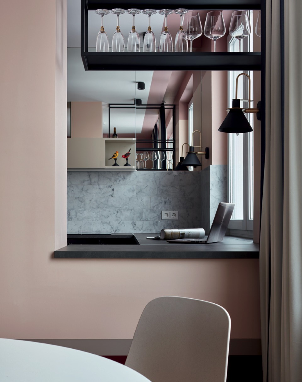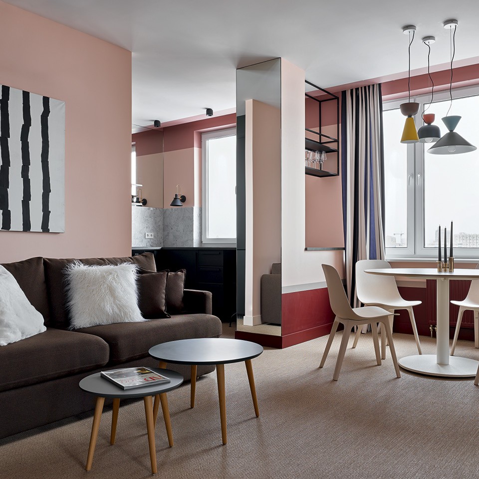 Дмитрий и Татьяна Хорошевы не устают повторять, что любые проблемы с планировкой можно скорректировать декоративными приемами. К ним обратилась молодая семья с двумя дочерьми: они купили двушку в новостройке и попросили сделать яркую, жизнерадостную квартиру, где можно и отдохнуть, и поработать, и поиграть с детьми. “Нам повезло с количеством окон, поэтому из двух комнат мы смогли сделать три: отдельные спальню и детскую и объединенное пространство гостиной, столовой и кухни”, — рассказывают архитекторы. В квартире нет несущих стен, но есть колонны посреди гостиной и несколько ниш и выступов, которые портили геометрию помещения. “Если хочешь что-то скрыть, используй зеркало, — делятся фирменным приемом Хорошевы. — Даже узкие выступы в десять-пятнадцать сантиметров можно нивелировать при помощи узкого зеркального полотна, и несовершенство планировки становится незаметным”. Ту часть кухни, что наиболее видна из гостиной, решили визуально облегчить. Для этого отказались от верхних шкафов, заменив их зеркалами, — подобный трюк заметно увеличил объем помещения и сделал его воздушным. В этой квартире превалируют два цвета — красный и розовый, а также их оттенки. Например, верхняя часть стен и край потолка выкрашены в брусничный. “Такой кант смещает геометрию пространства, и становится непонятно, какая высота потолков”, — поясняет Дмитрий. По мнению архитекторов, краски — самое доступное средство сделать классное пространство, если бюджет ограничен.