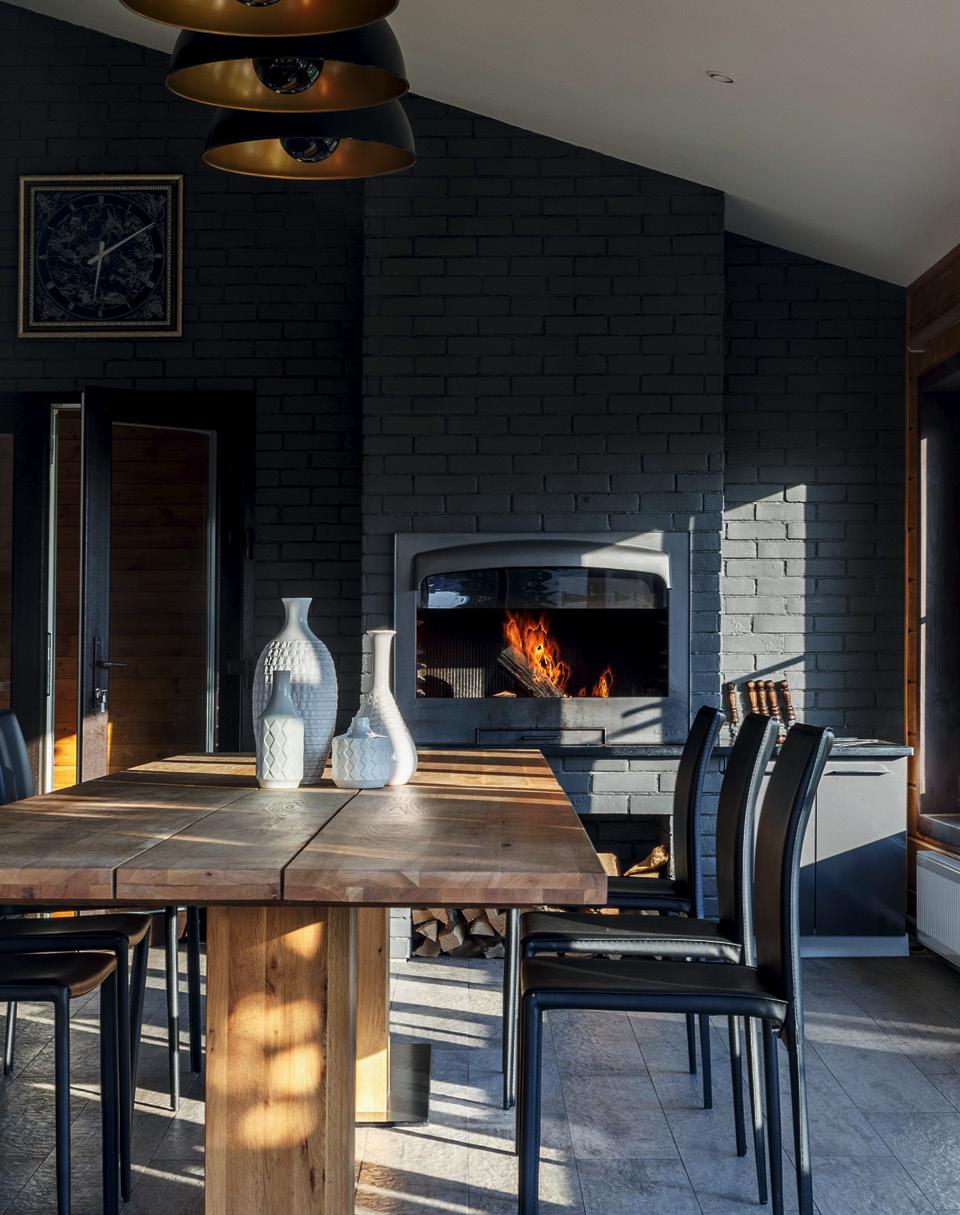 Гостиная в основном доме. Консоль под телевизор и столики сделаны на заказ по эскизам архитектора. Диван, Mobel & Zeit. Каминная топка, Spartherm. Люстра Ukiyo G по дизайну Мануэля Вивиана, Axo Light. Встроенные светильники, Centrsvet. Торшер, Arco White, Kare. Стены покрашены краской, Tikkurila, и частично отделаны керамогранитом, Atlas Concorde и Levantina. Паркетная доска, Boen.Кухня во втором домике. Стол и кухонный гарнитур сделаны на заказ по эскизам архитектора. Стулья, Bonaldo. Встроенные светильники, Centrsvet. Люстры, Rotaliana. Стены отделаны панелями из массива кедра, краска Tikkurila. На полу керамогранит, Atlas Concorde. Дверь, Sofia.