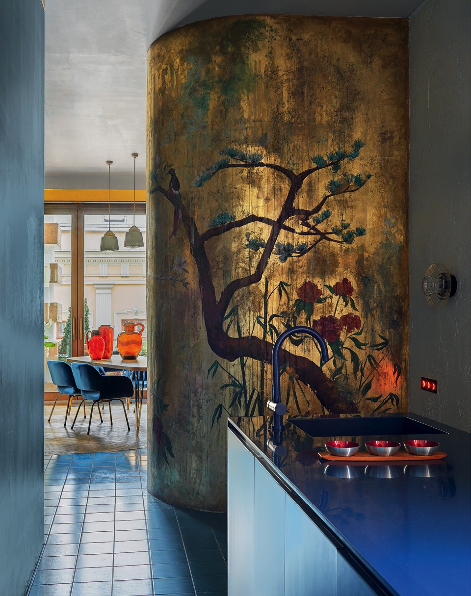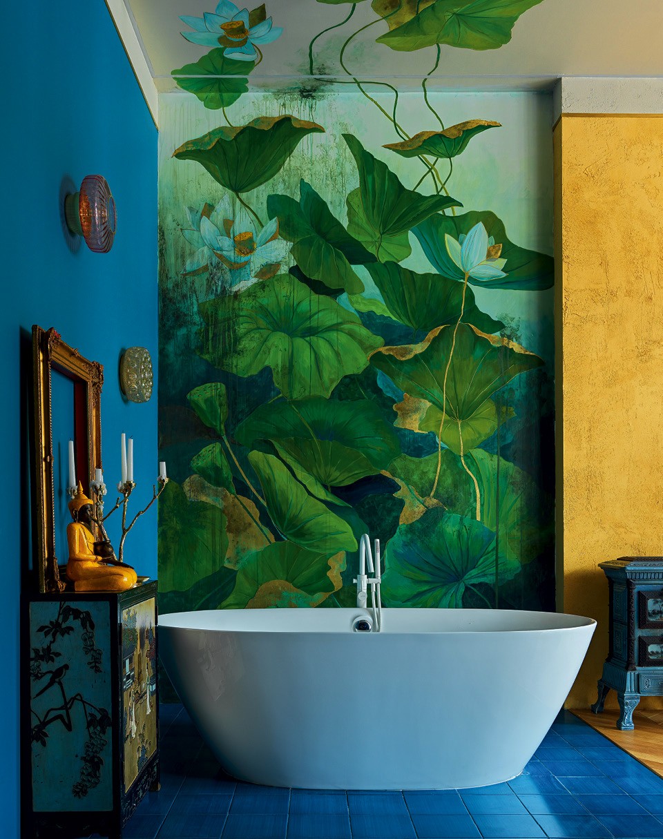 Выступающую полукругом стену гардеробной Дарья решила украсить состаренной росписью в стиле шинуазри. Она загадочно поблескивает в лучах солнца, которого в квартире с такими окнами хоть отбавляй. Еще один рисунок, с лотосами, появился в зоне ванной. Он покрыт живописными подтеками, которые, судя по близости к воде, будут только прогрессировать. Василькова вообще считает, что в потертостях и несовершенстве нет ничего плохого: “Главное, чтобы вещь красиво старилась”. Этой концепции соответствует неравномерно прокрашенная плитка ручной работы, которой частично выложен пол и обшит санузел, и сплетенные из тряпичного материала коврики и куклы-русалки, и разбросанные по стенам пуговки-светильники. Хотя в квартире нет прямых отсылок к южным странам (разве что стены охристого оттенка, напоминающего цвет фасадов во многих итальянских городах), в ней чувствуется радость жизни, тепло и легкая отпускная расхристанность. Даже мозаичный Владимир Ильич имеет яркий дискотечный раскрас. Не зря же у окна примостилась диджейская стойка — танцуют все.