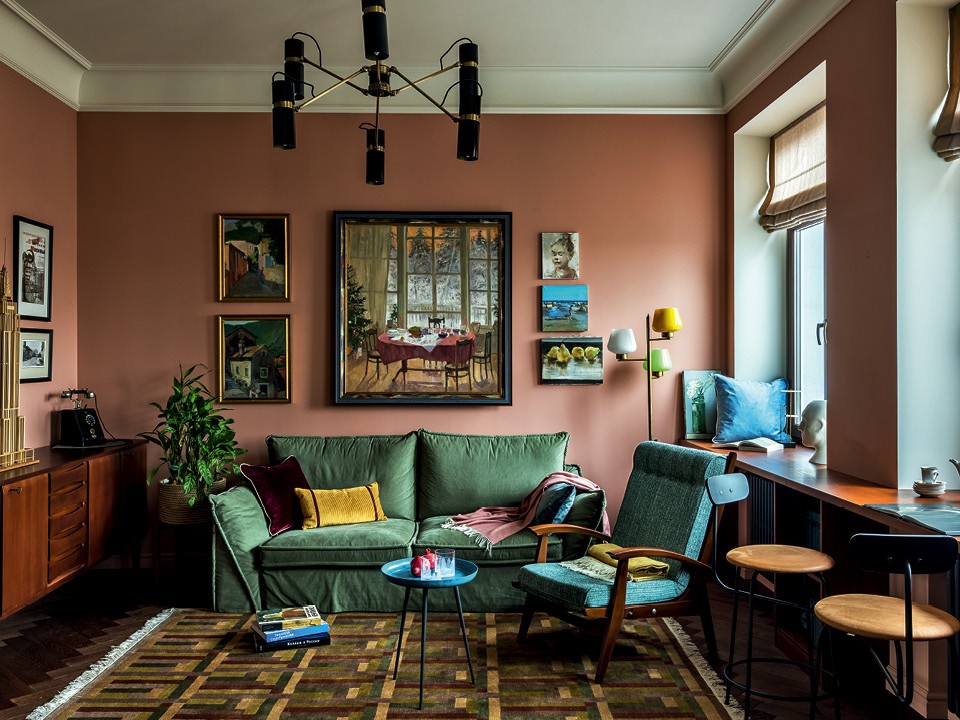 Это был необычный и приятный опыт — начать работу с покупки искусства”, — говорит архитектор Мария Амелина. На выставке в Alpert Gallery они с заказчицей приобрели две картины: “Рождественское утро” Василия Нечитайло и натюрморт Василисы Нечитайло, которые теперь висят в гостиной. Рассветное утро и “наградило” это пространство розовым оттенком стен. “Все клиенты — люди настроения. И если у них появилось желание купить произведение искусства, надо оперативно его фиксировать”, — смеется архитектор. Ей повезло не только с заказчицей (они работают вместе уже в четвертый раз, и у них сложились доверительные отношения), но и с рабочей бригадой, и со “строительной площадкой”. Эта квартира находится в доме 1935 года по проекту Сергея Леонтовича. Потолки высотой 3,5 м и пять окон, выходящих на три стороны, откуда открываются виды на сталинскую высотку на площади Восстания, дом‑коммуну Моисея Гинзбурга, — это мечта любого дизайнера или архитектора. Изначально квартира была двушкой, но Амелина избавилась от всех перегородок и оставила изолированной только спальню. Архитектор не только изменила планировку, но также