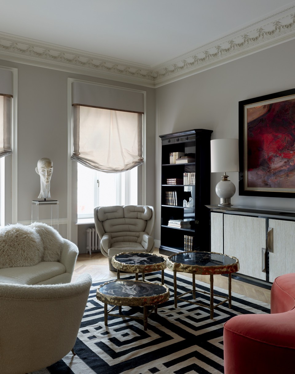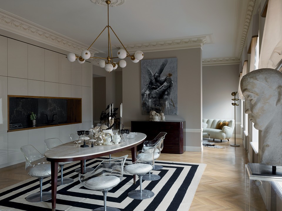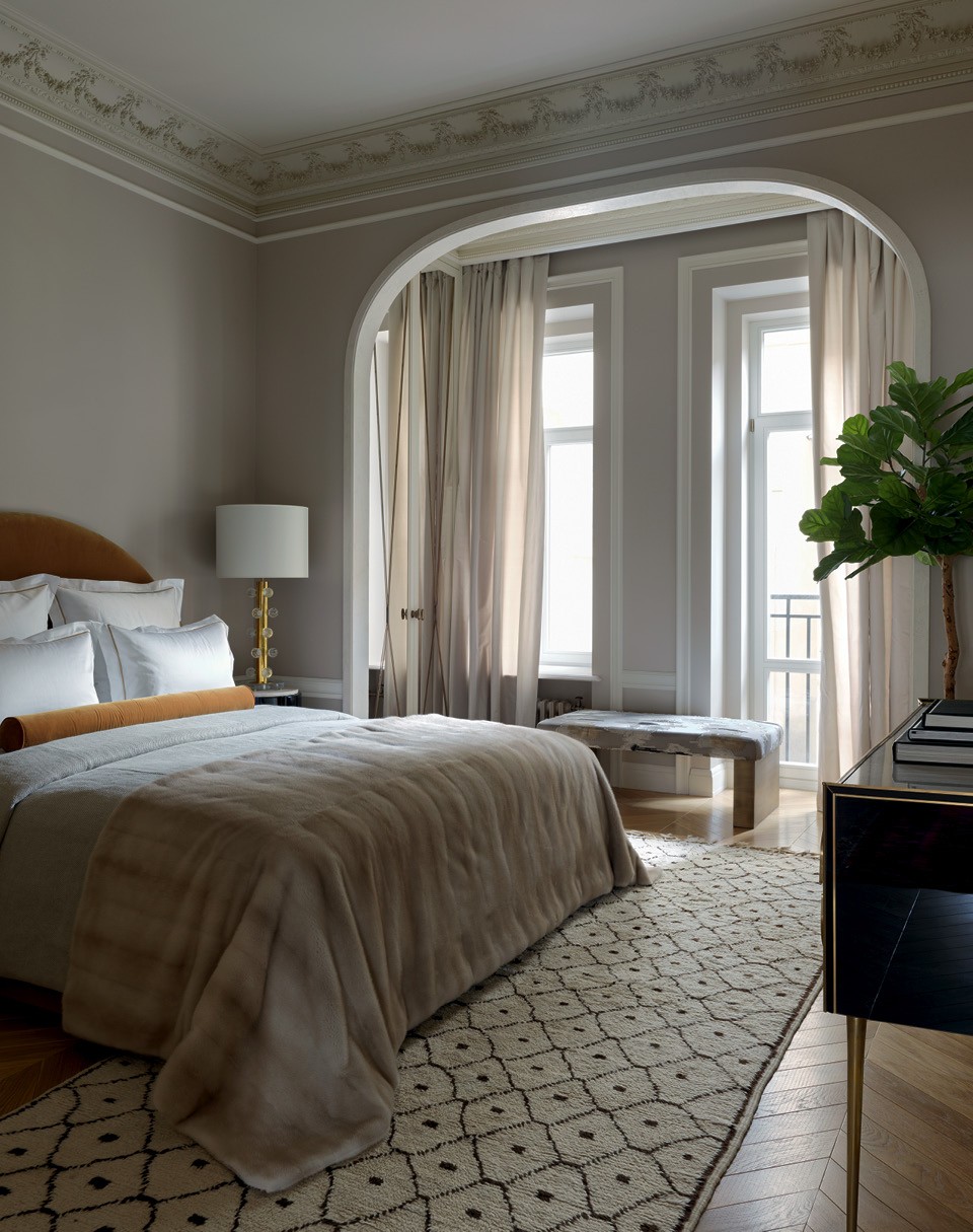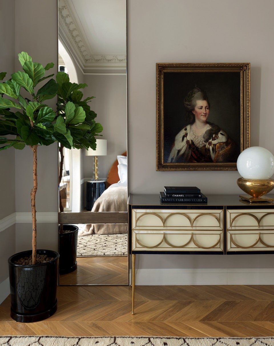 Квартира в трех шагах от “Мехового холодильника” (здания 1912 года постройки, где базируется компания “Меха Екатерина”) стала удобным дополнением к загородному дому Екатерины. “У меня огромная семья, мы еле помещаемся в доме — сыновья, бабушки, дедушки, — но иногда нужно остаться в центре, — рассказывает она. — Я купила квартиру еще до начала реконструкции, поэтому у меня было много времени, чтобы подумать над планировкой”. Обычно Екатерина оформляет свои дома сама, так же она хотела поступить и здесь и даже успела сделать санузлы и пустить по периметру комнат лепнину. А потом решила, что вдвоем будет проще, и пригласила старую знакомую — Лейлу Улуханли. “Не представляю себе, как люди отдают интерьер на откуп дизайнеру. Я так не могу, — рассказывает Екатерина. — Мне очень нравятся работы Лейлы, но жить-то мне! Поэтому проект у нас получился совместный”. И это не преувеличение: за мебелью заказчица и декоратор отправились в Париж и в итоге купили почти все на блошином рынке Сент-Уэн. “Мы ходили туда как на работу”, — смеется Екатерина.