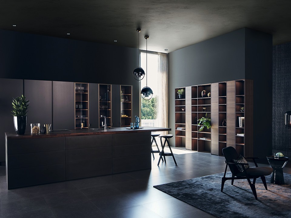 Кухонный остров у этой модели Leicht довольно функциональный: здесь и зона готовки, и барная стойка, и продуманная система хранения для посуды и столовых приборов; с внешней стороны сразу девять ящиков, так что беспорядок на этой кухне практически невозможен. Фасады из серии Steel покрыты смесью эмульсии, стальной пыли, кислоты и полуматового лака, что значительно повышает прочность поверхности.
