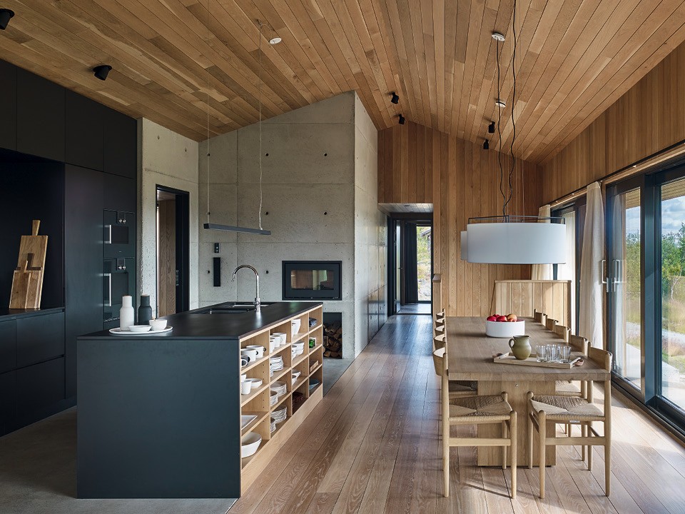 Для дома на Майорке дизайнер Мануэль Вильянуэва решил отлить кухонный остров из бетона и декорировать его панелями из ореха. “Эта древесина прочнее сосны, и у нее потрясающая текстура”, — рассказывает автор. Остров совмещает зону готовки и место для быстрого завтрака. Над ним дизайнер повесил лаконичный светильник Apparatus.