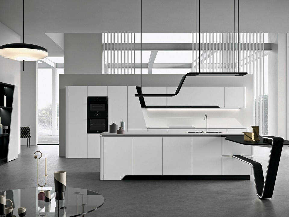 Модель Vision от Snaidero состоит из рабочей зоны и острова с мойкой и выносом. В эту футуристическую конструкцию из гнутого черного ясеня встроены розетки, а по кромке проложена светодиодная лента. В пару к ней дизайнеры Pininfarina создали светильник над островом из такой же древесины.