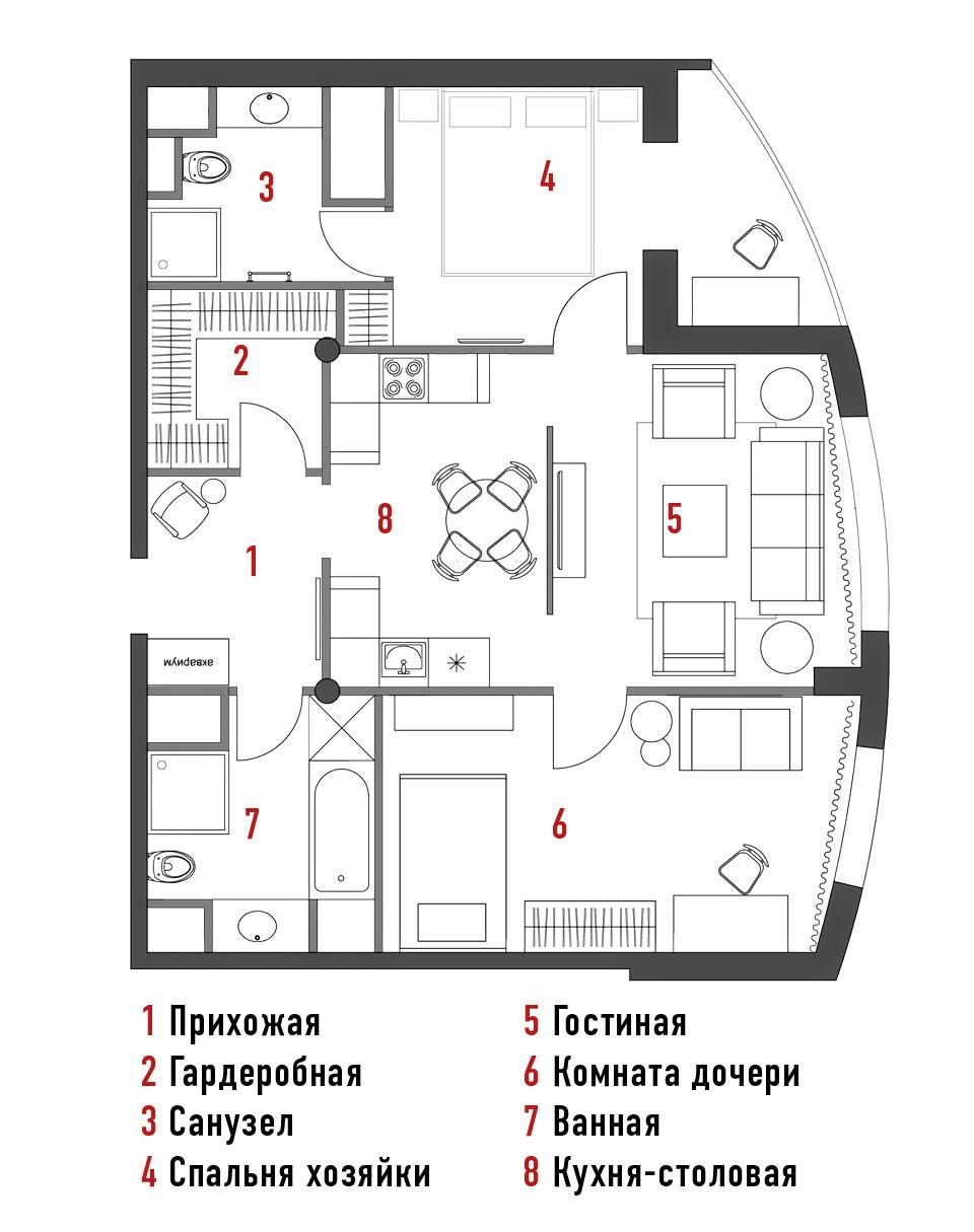 В квартире всего три окна, так что Федорова сдвинула все второстепенные помещения вглубь квартиры, а жилые комнаты расположила поближе к свету. Гостиная находится в центре квартиры, разделяя ее на мамину и дочкину половины. Ощущению простора в гостиной способствуют 3,5‑метровые потолки. “Если посмотреть на план, мебель здесь стоит плотно, но благодаря потолкам комната выглядит воздушной”. Декоратор подчеркнула высоту комнаты с помощью сделанного на заказ стеллажа. А столик в форме восьмерки, который тоже изготовлен по эскизам Екатерины, упрощает движение по комнате. Основа цветового решения — светлые стены с синими и коралловыми акцентами — была