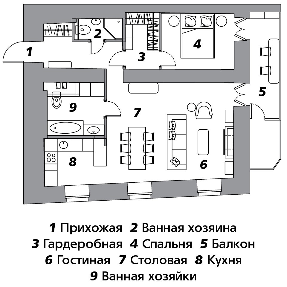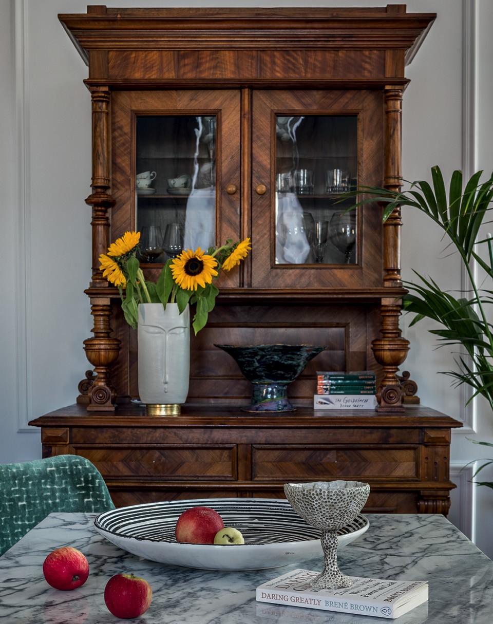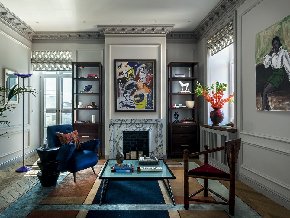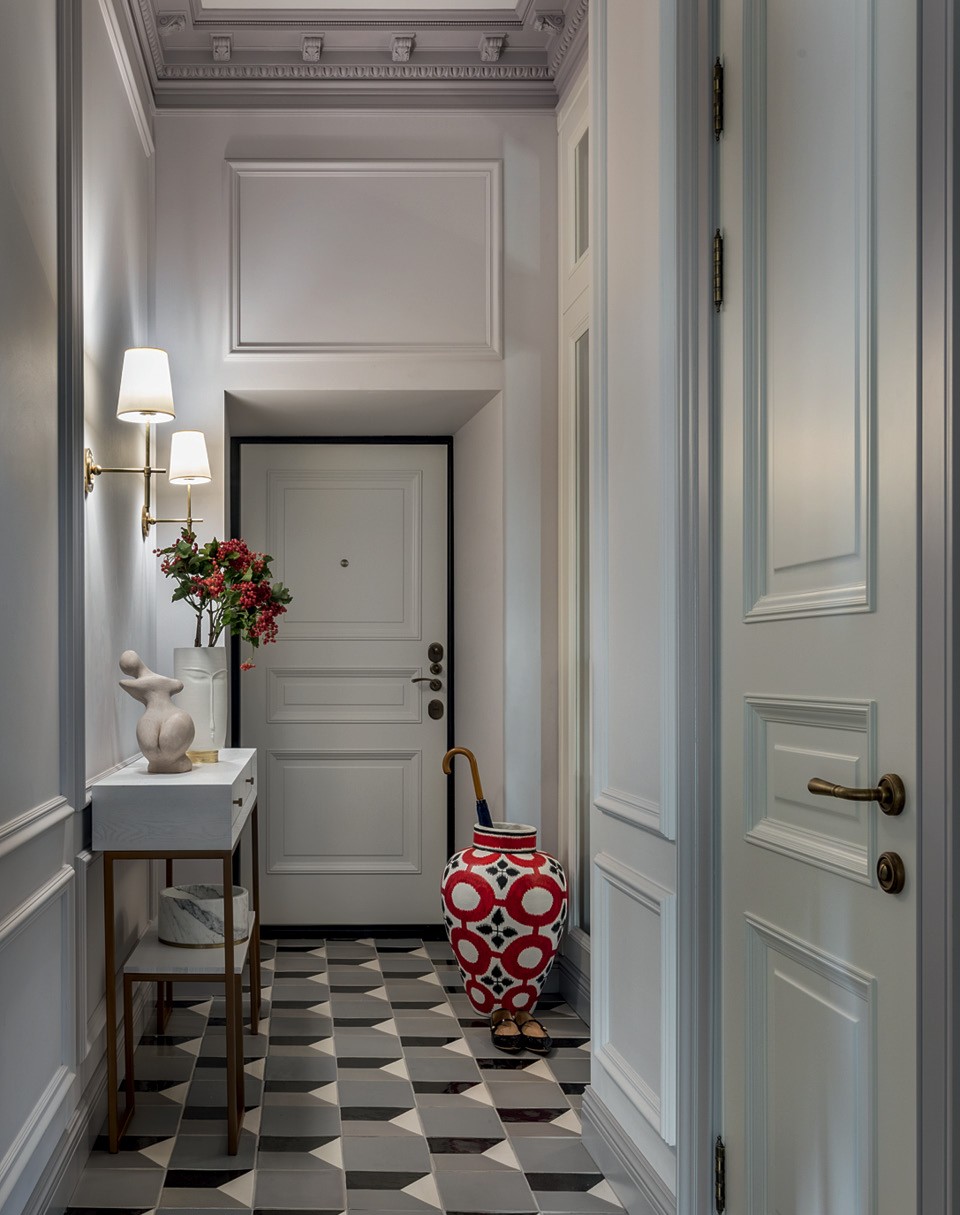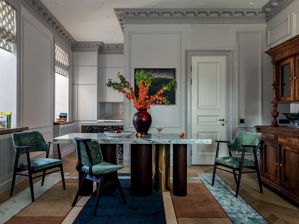 Дом, в котором находится квартира, — дореволюционный, но в начале 2000‑х годов здесь прошла полная реконструкция. И как ни мечтала Ольга восстановить оригинальные архитектурные детали, концов было не найти. Так что двери, гипсовая раскладка на стенах и карнизы — импровизация на историческую тему. Для хозяина важно было воссоздать в квартире традиционный антураж, и важной частью этого образа был для него камин. Но попытки получить разрешение на устройство настоящего очага закончились ничем, так что пришлось ограничиться декоративным порталом. Зато удалось отреставрировать старинный буфет, доставшийся хозяину по наследству. Это единственный классический предмет в квартире — заказчик с дизайнером сразу условились, что наполнят традиционную “оболочку” современными вещами. Возможности для перепланировки квартиры были сильно ограничены несущими стенами, но кое-что Ольга все же поменяла: расширила гостевой туалет, выкроив в нем место для душа (два полноценных санузла были условием заказчика), присоединила боковой коридор к гостиной и убрала дверь между жилой зоной и кухней. Зона готовки здесь хоть и небольшая, но полноценная: хозяева планируют собирать дома друзей за ужином. Большой обеденный стол — единственный, но важный вклад в обстановку молодой жены заказчика. Этот предмет сделан на заказ и благодаря своим массивным ножкам стал доминантой интерьера.