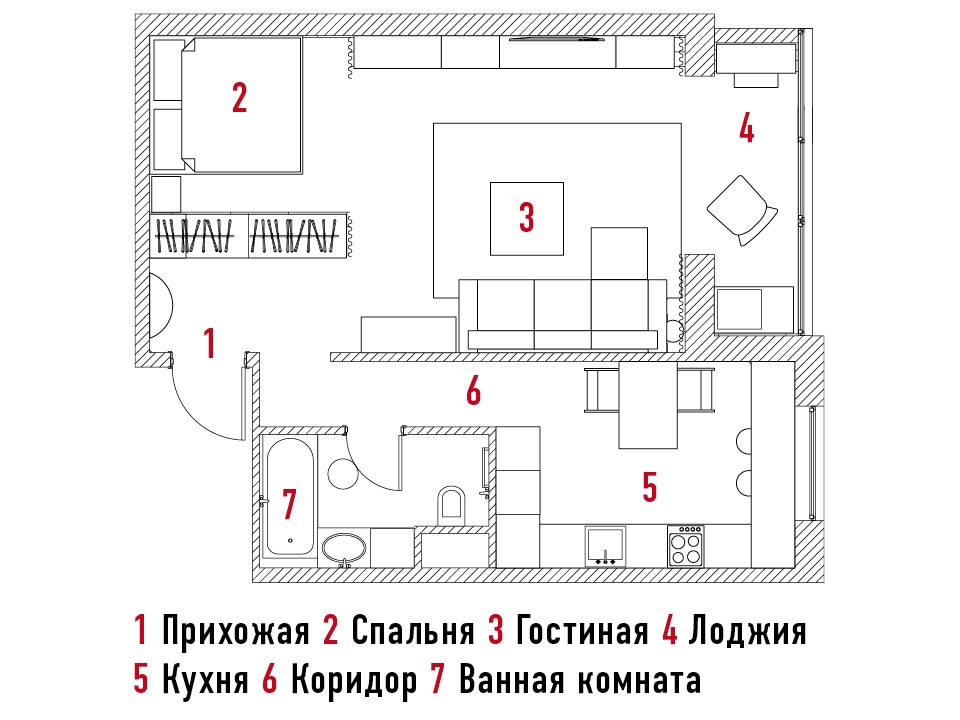 Клиентка хотела, чтобы у нее была просторная гостиная, спальня с полноценной кроватью, много мест для хранения и туалетный столик. Так после перепланировки спальня оказалась на месте прихожей. От входа ее отделяет двусторонний гардероб, доступ в который есть из обоих помещений. В гостиной вдоль одной из стен появился большой шкаф.