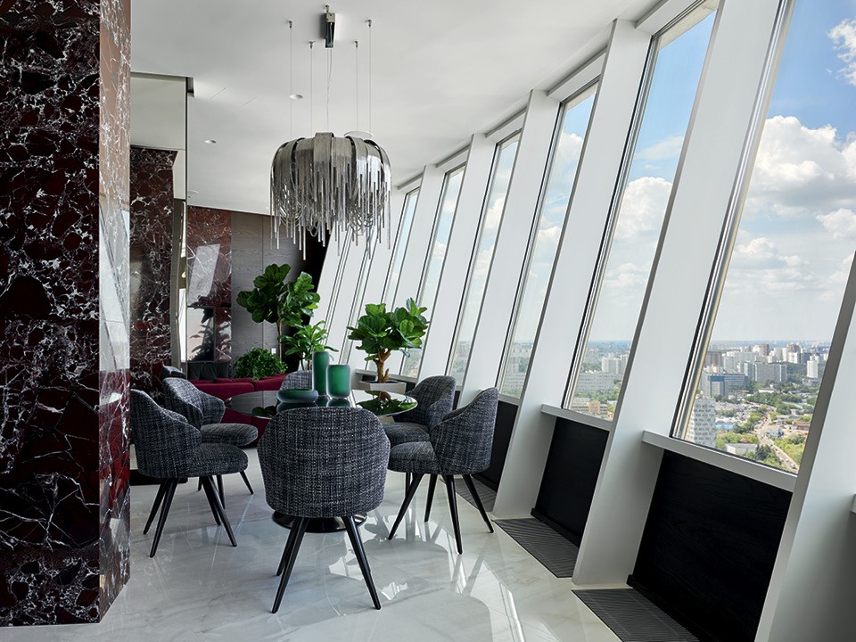 Ариане и Татьяне досталась в работу квартира с эффектным расположением — она находится на верхнем этаже жилого комплекса “Дирижабль” и поражает панорамой Москвы. Заказчики хотели, чтобы интерьер с таким видом был современным, легким и воздушным. Ахмад и Карякина щедро распорядились пространством площадью сто пятьдесят пять квадратных метров: они разнесли хозяйский блок и детскую спальню со своей гардеробной и ванной комнатой в противоположные концы, а пространство между ними оставили под общую зону с гостиной, столовой и кухней.
