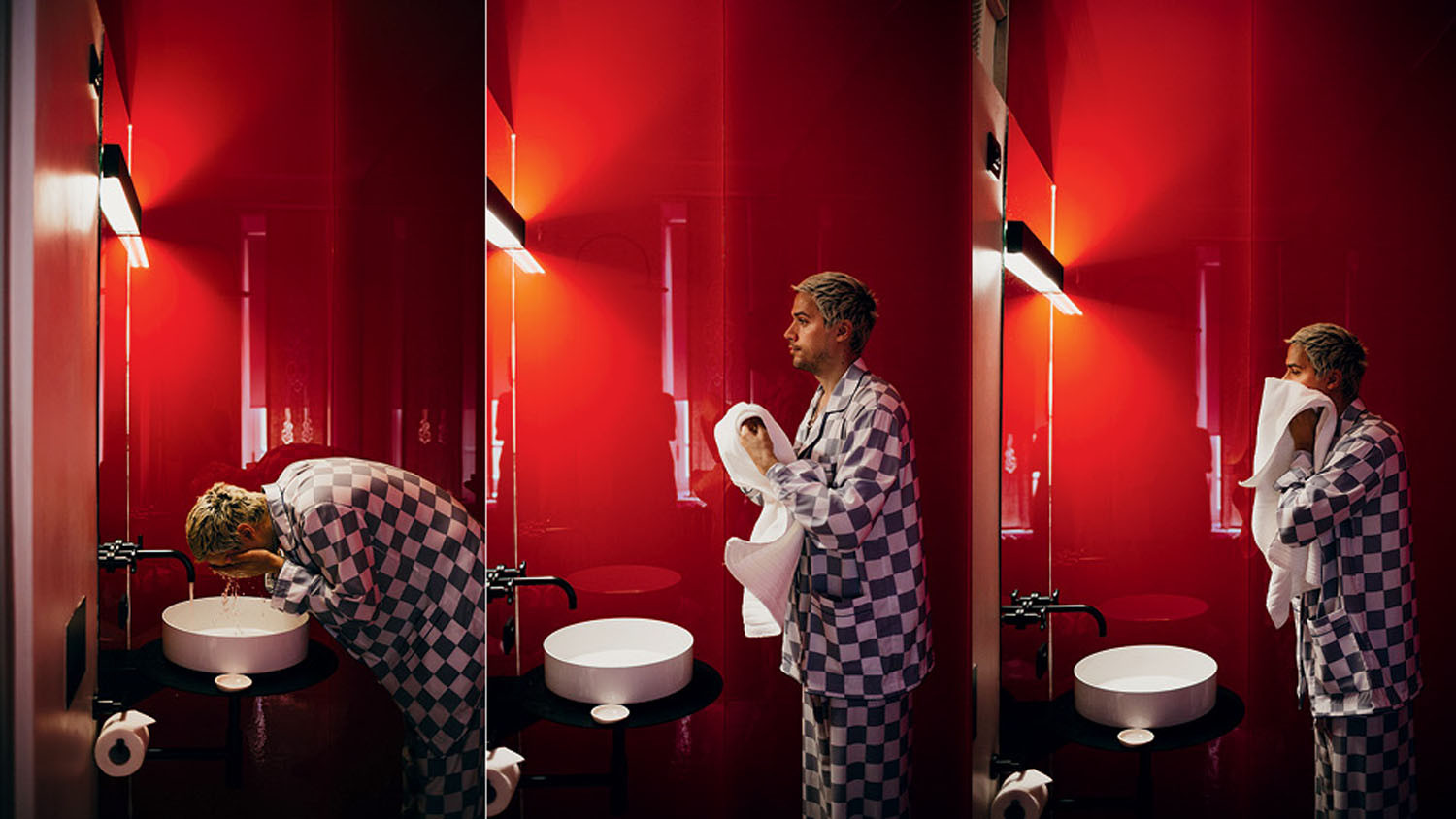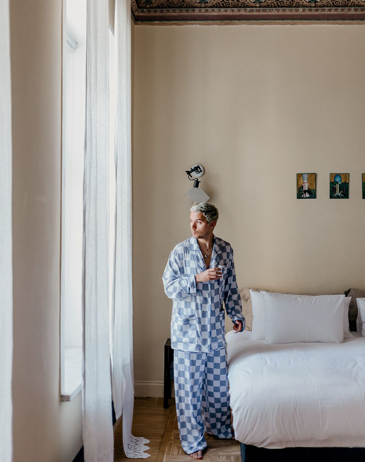 Утро Гарри начинается с проверки входящих сообщений. Так как он работает сразу на нескольких континентах, поток информации не заканчивается никогда. Этим утром дизайнер встретил нас в своей клетчатой пижаме на пороге номера отеля “Рихтер” — в этот приезд в Москву свободного времени у Гарри почти нет, поэтому он решил переночевать недалеко от офиса.