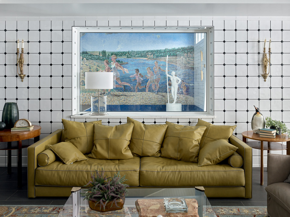 Екатерина хотела, чтобы интерьер комплекса больше напоминал обстановку советских санаториев, а не традиционных русских бань. Так здесь появилось мозаичное панно по мотивам картин Александра Дейнеки и белая кафельная плитка. “Помню, когда я только начинала заниматься оформлением интерьеров, не понимала прелести белой плитки и решила для себя, что когда смогу оценить ее эстетику, тогда вырасту как дизайнер”, — рассказывает Водолацкая. Попав в это пространство впервые и буквально ошалев от белых кафельных стен, Мария поняла, что момент настал.
