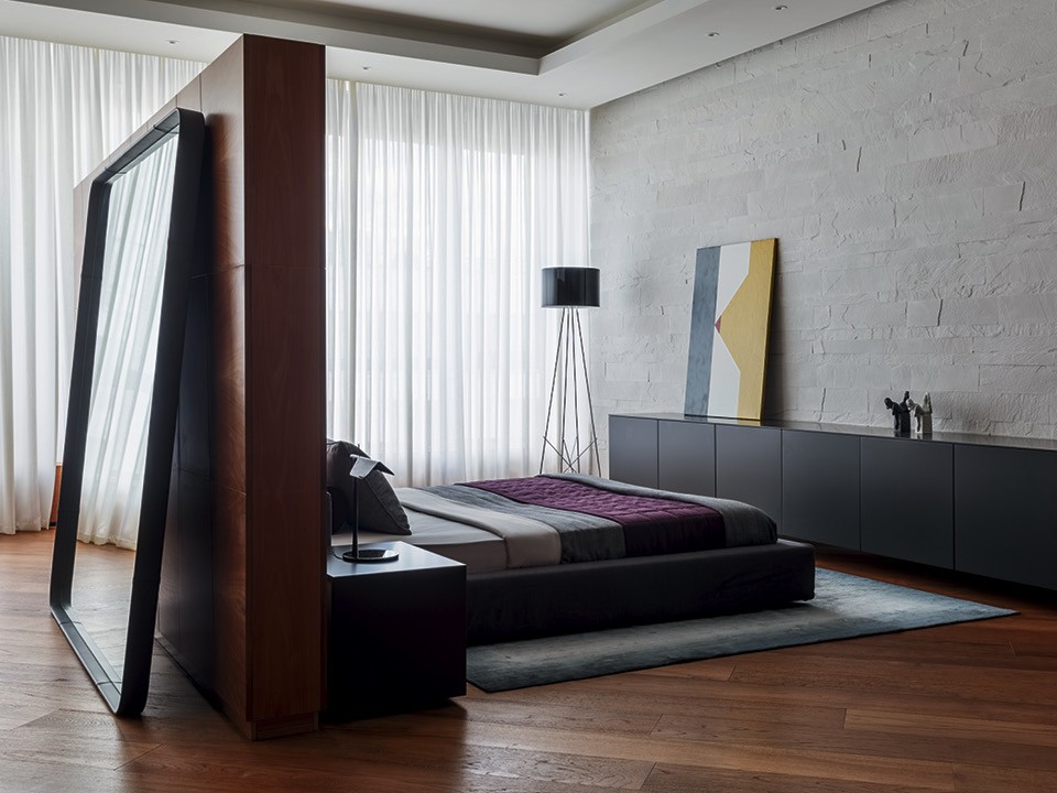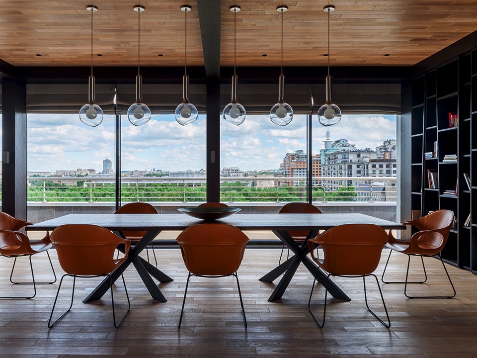 Работа двигалась быстро. Георгий и Тимур полностью изменили планировку квартиры и организовали интерьер вокруг двух встроенных объемов (внутри них находятся системы хранения и санузлы). Один такой кубик “держит” на себе общественную зону, другой — приватную часть пентхауса. Террасу архитекторы поделили на две части: 40 м² оставили под открытым небом, остальные 60 м² присоединили к квартире. Это была самая сложная часть проекта: пристройку требовалось согласовать, зрительно связать с фасадом и подвести туда все коммуникации — предполагалось, что это будет не зимний сад, которым пользуются время от времени, а полноценное жилое помещение. Так квартира получила свою самую эффектную часть — огромную столовую с панорамным остеклением. В других комнатах окна тоже большие, но до пола не дотягивают, и авторы проекта приблизили виды к хозяевам, превратив подоконники в диванчики, сидя на которых приятно смотреть на город.