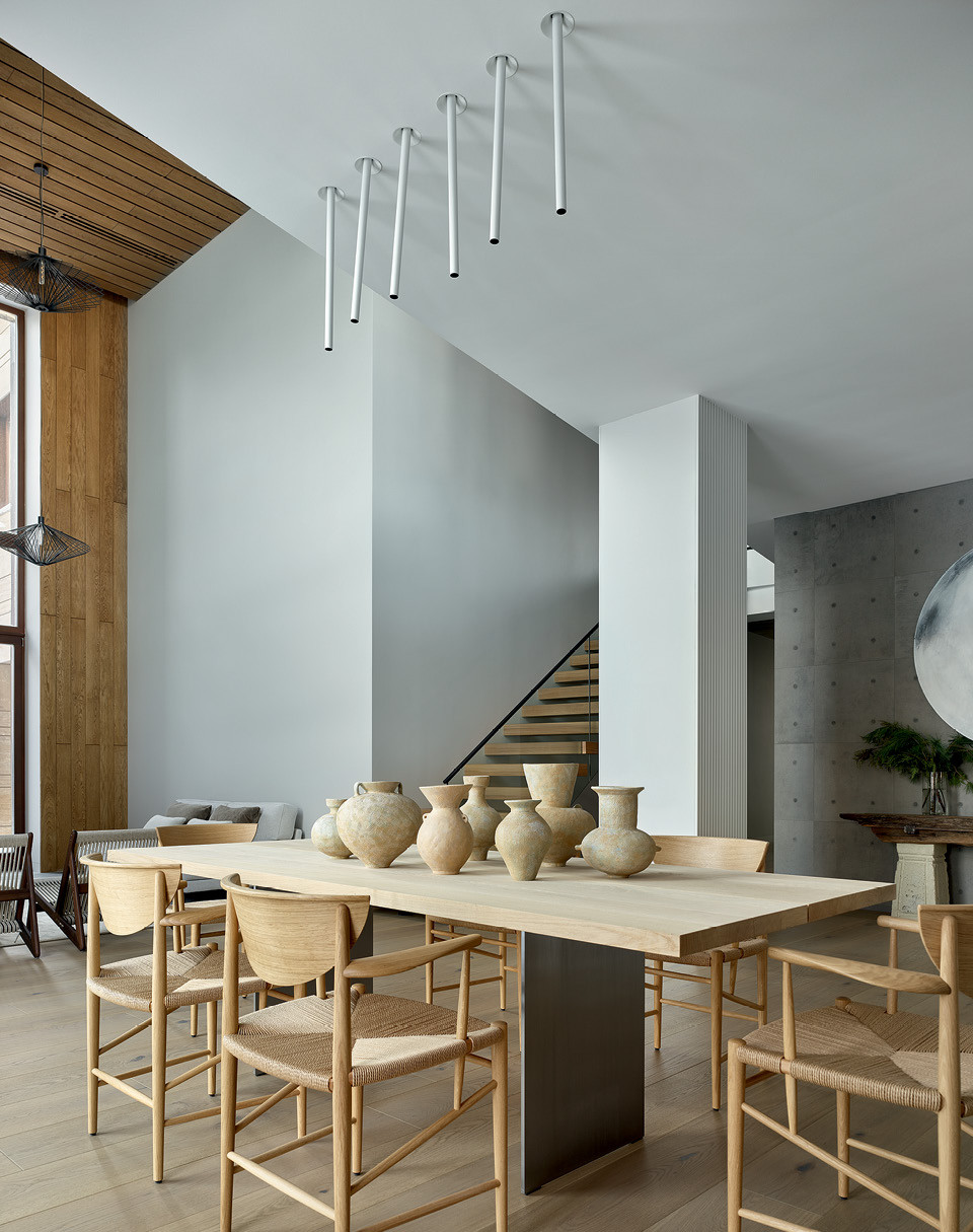 После реконструкции, длившейся три года (за нее команда архитекторов получила несколько профессиональных отечественных наград), на своих местах остались только несущие конструкции, все остальное перекроили на новый лад: снесли внутренние стены и перегородки, демонтировали часть перекрытий между первым и вторым этажом, чтобы получилось двусветное пространство, перенесли оконные и дверные проемы, крышу сделали плоской и эксплуатируемой и пристроили еще один небольшой объем, геометрия которого повторяла форму участка. Также в плане появилась диагональ, которая определила планировку и зонирование: это коридор, пронизывающий дом насквозь, в начале и в конце которого есть окна. Архитекторы называют его “световым разломом”, он является доминантой и главным смысловым элементом дома, объединившим все пространства первого этажа. “Коридор идет по диагонали, и стены там не параллельны, они постепенно сужаются. Получается своеобразная игра пространства, которую подчеркивает оттенок стен: светло-серый внизу становится плотнее на втором этаже”, — добавляет Мария Павленко.