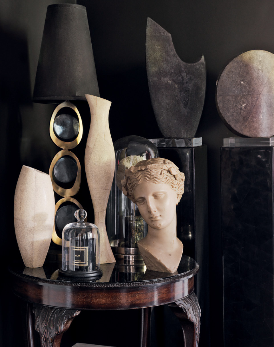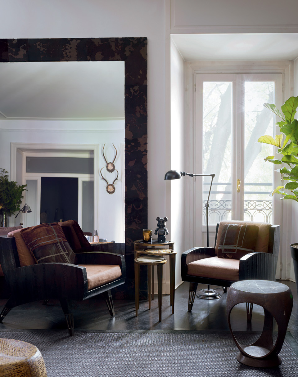 Скудную цветовую гамму интерьера хозяин разбавил богатыми по фактуре элементами — шерстяными пледами, каракулевыми подушками и предметами интерьера, обтянутыми кожей. Их проектируют его давние друзья, дизайнеры Риа и Йиури Аугусти. “Я покупаю что-то из каждой их коллекции, меня можно назвать постоянным клиентом”, — смеется Нил. Анималистичных деталей в квартире много: тут есть черепа, рога, чучело сокола и панцирь черепахи — все найдено на барахолках или в антикварных магазинах. Барретт объясняет это любовью к миру живой природы. “Меня восхищают животные, насекомые и птицы. Они самые красивые создания, которые меня постоянно вдохновляют”, — говорит он. Нил привез сюда много старинных предметов интерьера XVIII и XIX веков, доставшихся ему по наследству. Например, каминный портал (его теперь можно увидеть в столовой), комод и бар с маркетри и кресло-качалку, принадлежавшее его дедушке, который владел мебельной компанией в Плимуте.