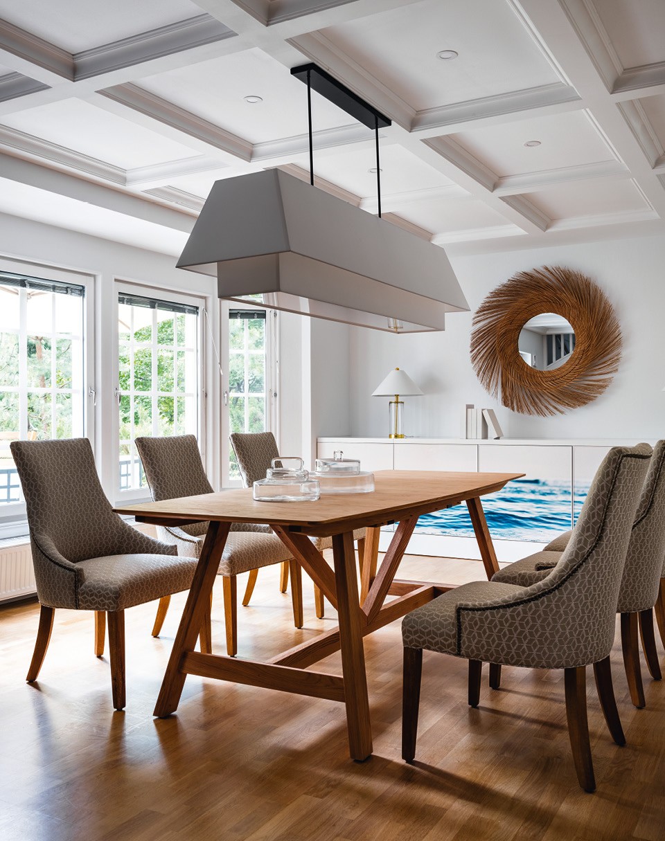Столовая. Комод сделан на заказ по эскизам дизайнера; на нем лампа, Loft Concept; зеркало, Maisons du Monde; обеденный стол, La Redoute; над ним абажур, сделанный на заказ в Bottega Design Studio; стулья, Gramercy Home.